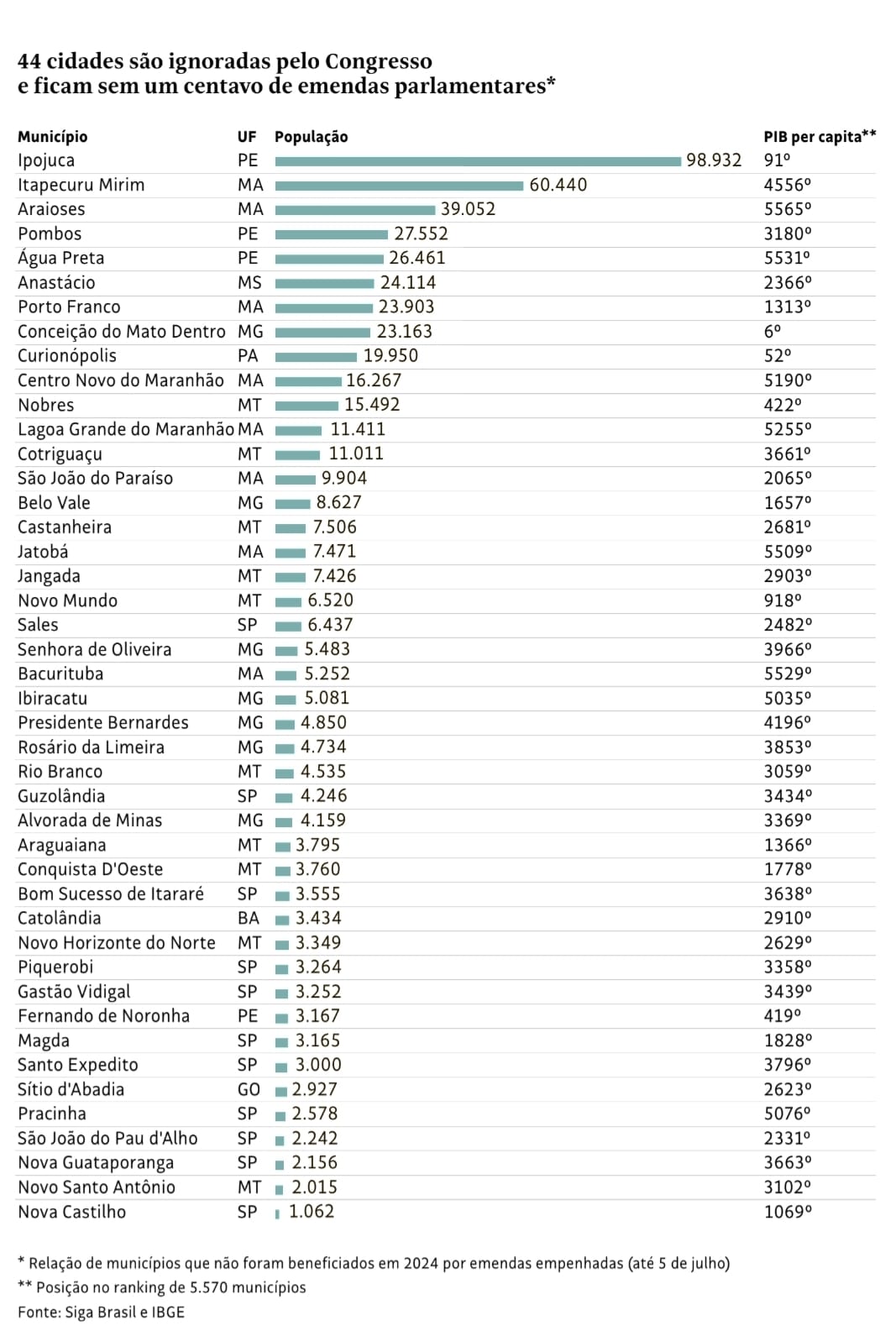 O clube dos esquecidos pelos congressistas inclui alguns dos municípios mais pobres do Brasil, mas também cidades com alto PIB per capita. Em alguns casos, desavenças políticas ajudam a explicar por que não pingou nenhum centavo de emendas nos cofres do Executivo local.