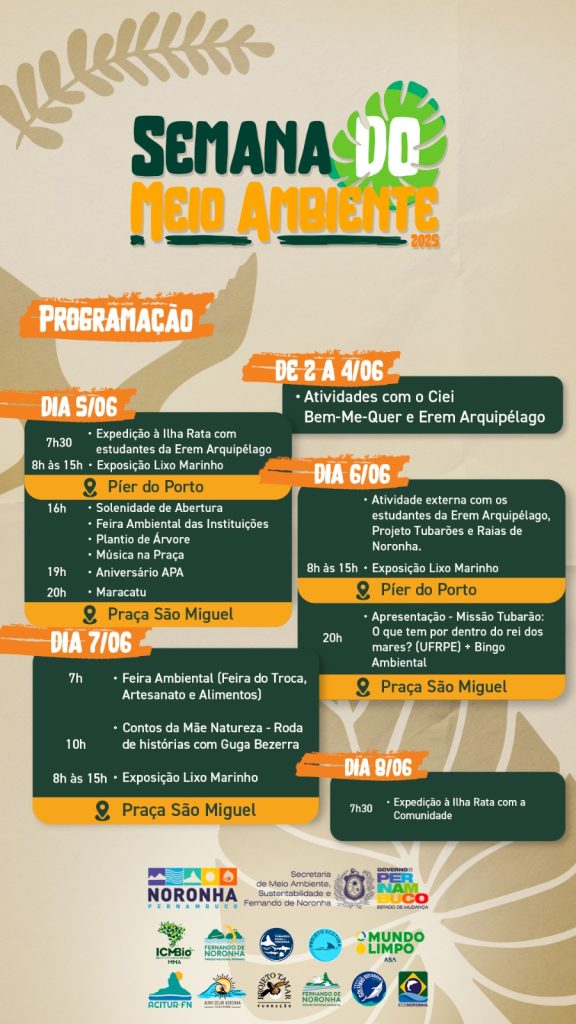 Segundo a coordenadora de Meio Ambiente, Isadora Beltrão, a agenda inclui ações educativas, culturais e de valorização ambiental, envolvendo escolas, instituições locais e a comunidade em geral que possui grande importância social, ambiental e educativa. “É uma oportunidade importantíssima para reforçar o nosso compromisso com a preservação desse lugar. Então, a programação foi pensada para envolver toda a comunidade, desde as crianças do Ciei Bem-Me-Quer, os alunos da Erem Arquipélago, até os moradores e turistas, porque o nosso objetivo é promover a conscientização ambiental de forma mais ampla, mostrando que todo mundo tem um papel na proteção do meio ambiente e que Noronha, além de ser um exemplo de beleza natural, também é um exemplo de responsabilidade ecológica”, reforçou Isadora.