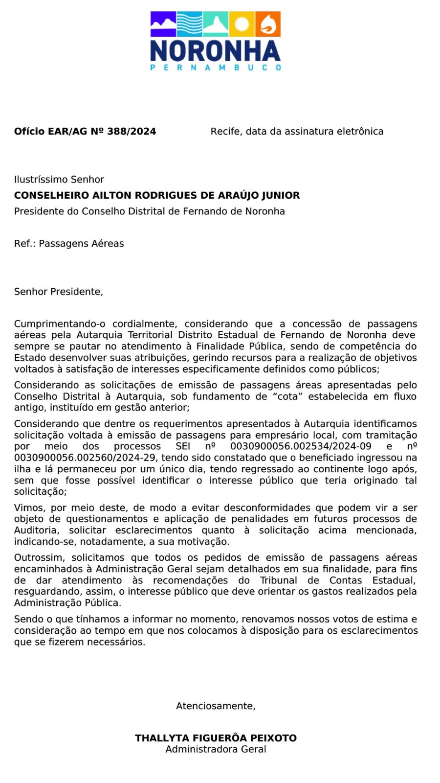 Sem citar nomes, Thallyta exige explicações de Ailton Rodrigues de Araújo Júnior sobre passagem emitida para que um empresário local, Davisson Lima Valença Cruz, conhecido como Caco, participasse de manifestação contra a própria administração da ilha, por atraso nas obras de restauração da pista do aeroporto local.
