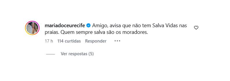 A usuária @mariadoceurecife lembrou da taxa de bombeiros: “Avisa que não tem Salva Vidas nas praias. Quem sempre salva são os moradores. Pagamos taxa anual de bombeiros que deveria garantir salva-vidas.”