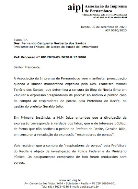 Do Blog da Noelia Brito — A Associação da Imprensa de Pernambuco, entidade de Imprensa mais antiga de Pernambuco e a terceira mais antiga do Brasil, que há quase 90 anos exerce a missão de preservar e defender o princípio democrático da livre informação, por intermédio de seu presidente, Múcio Aguiar Neto, encaminhou ofícios ao Presidente do TJPE, Desembargador Fernando Cerqueira e ao Desembargador Francisco Tenório manifestando preocupação com a censura imposta ao Blog da Noelia Brito por este último, que deferiu a medida proibindo este veículo de se utilizar da expressão correntemente utilizada por outros veículos e populares para nominar os respiradores testados apenas em porcos e que estão proibidos de serem utilizados em seres humanos, de modo que este veículo é o único na face da terra proibido de utilizar tal expressão.