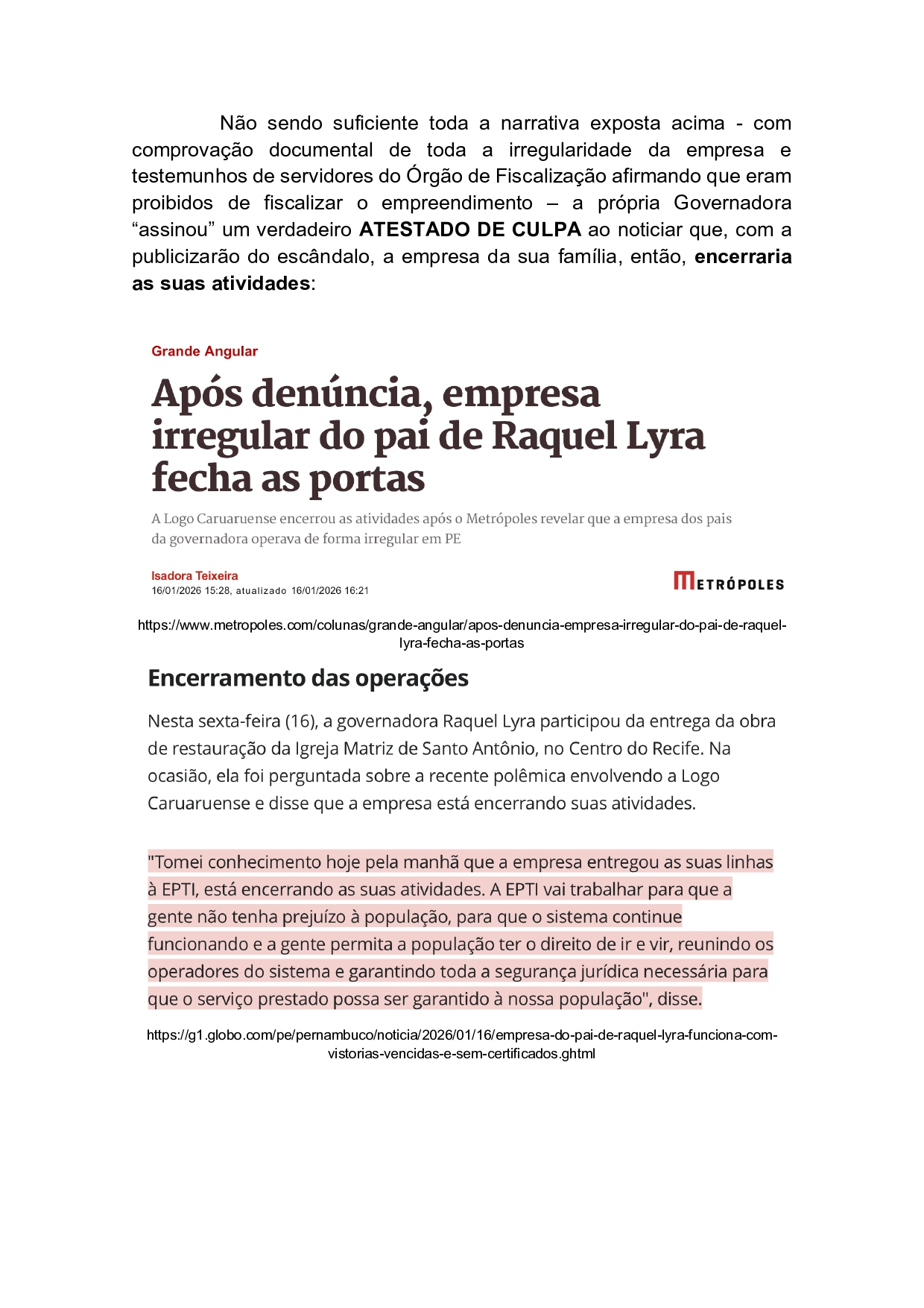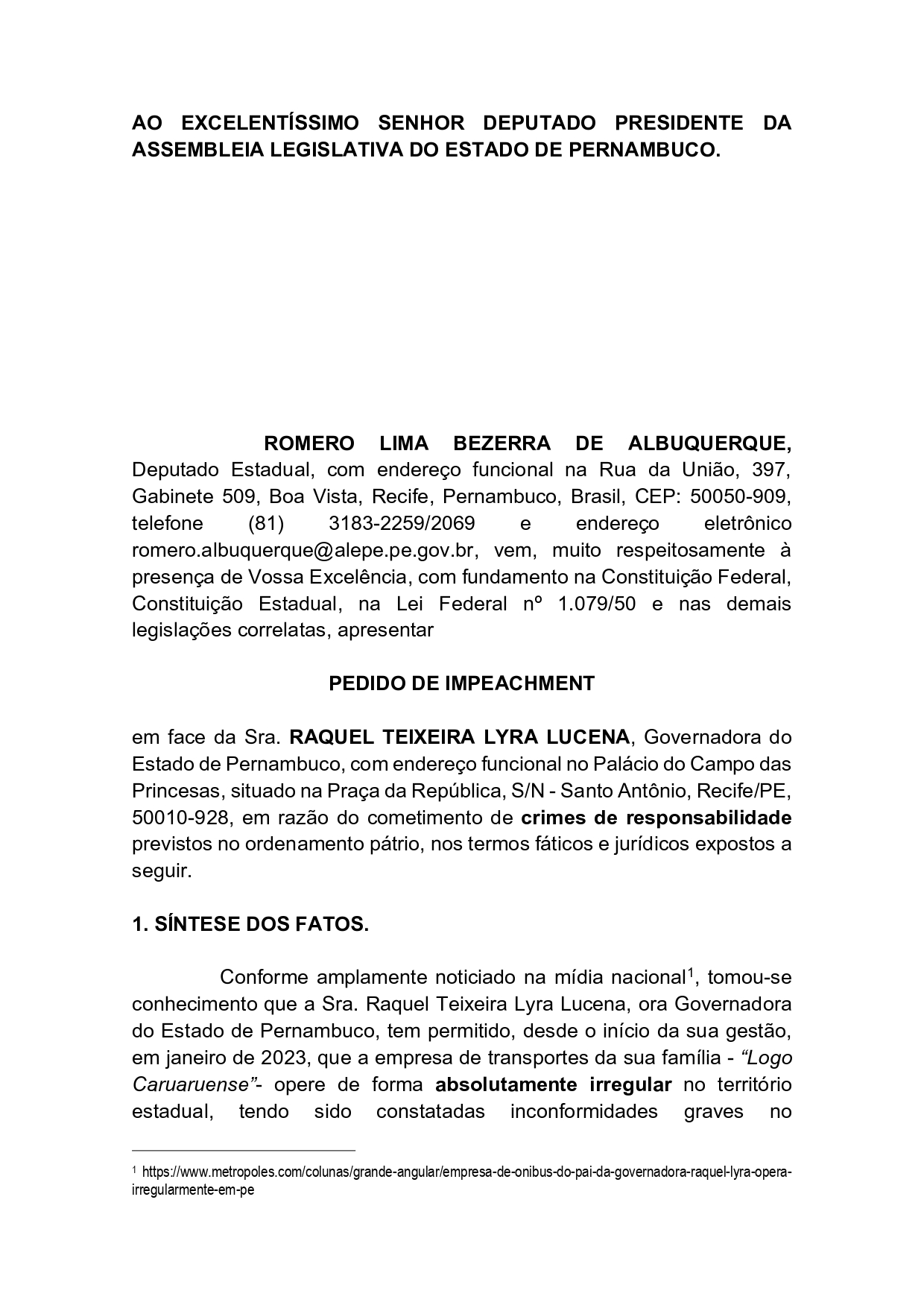 “A Presidência da Assembleia Legislativa de Pernambuco (Alepe) informa que recebeu, formalmente, o pedido de impeachment da governadora Raquel Lyra, apresentado pelo deputado Romero Albuquerque (União Brasil).