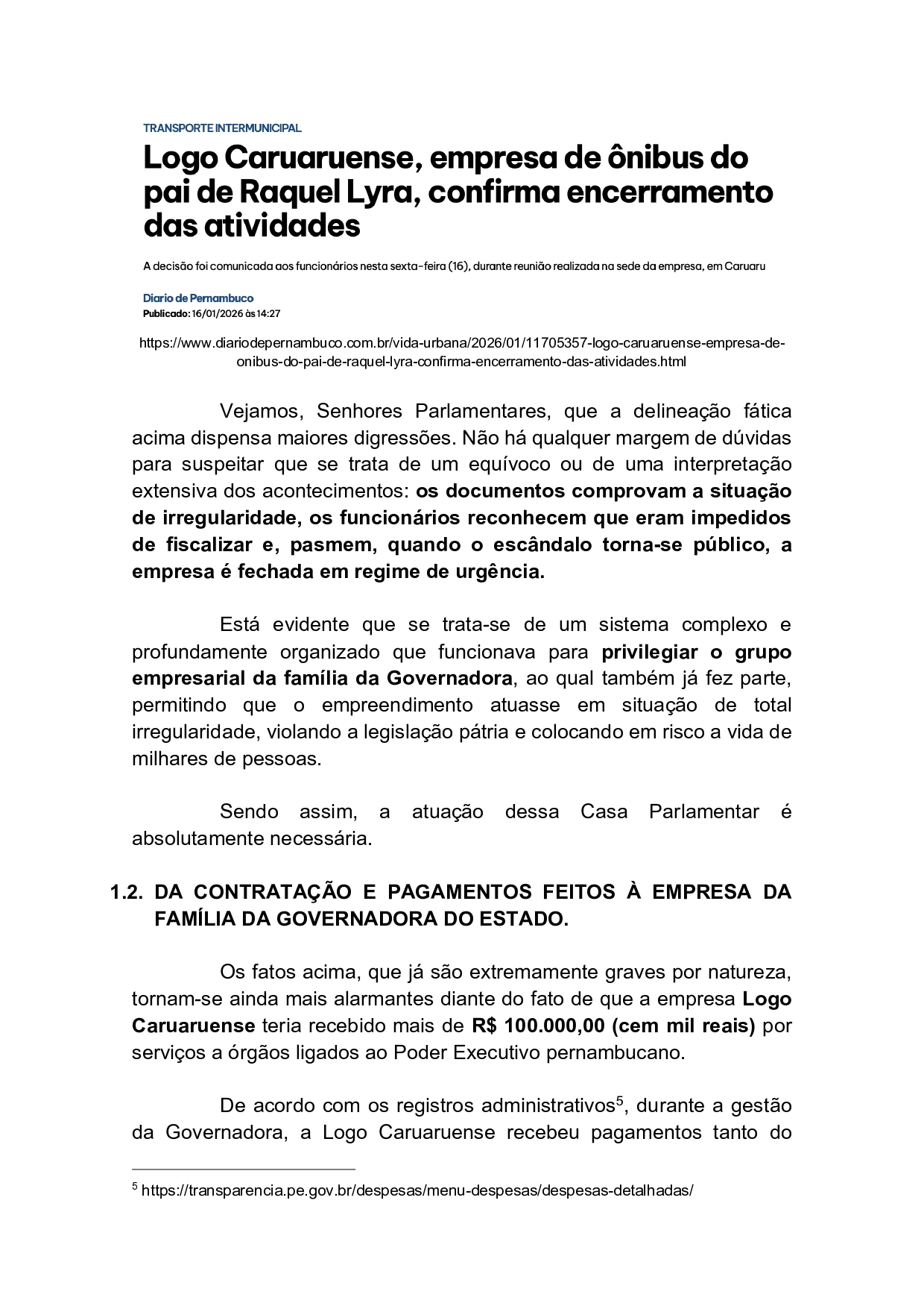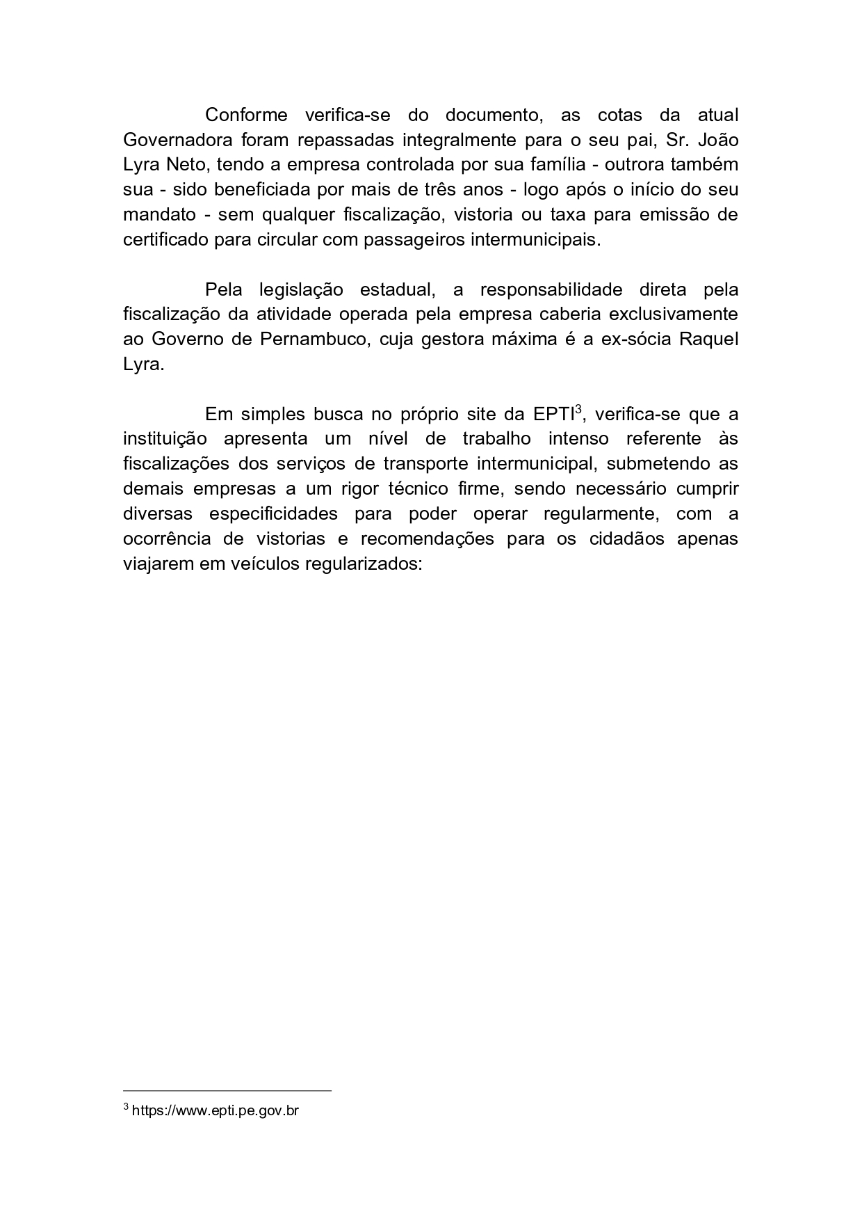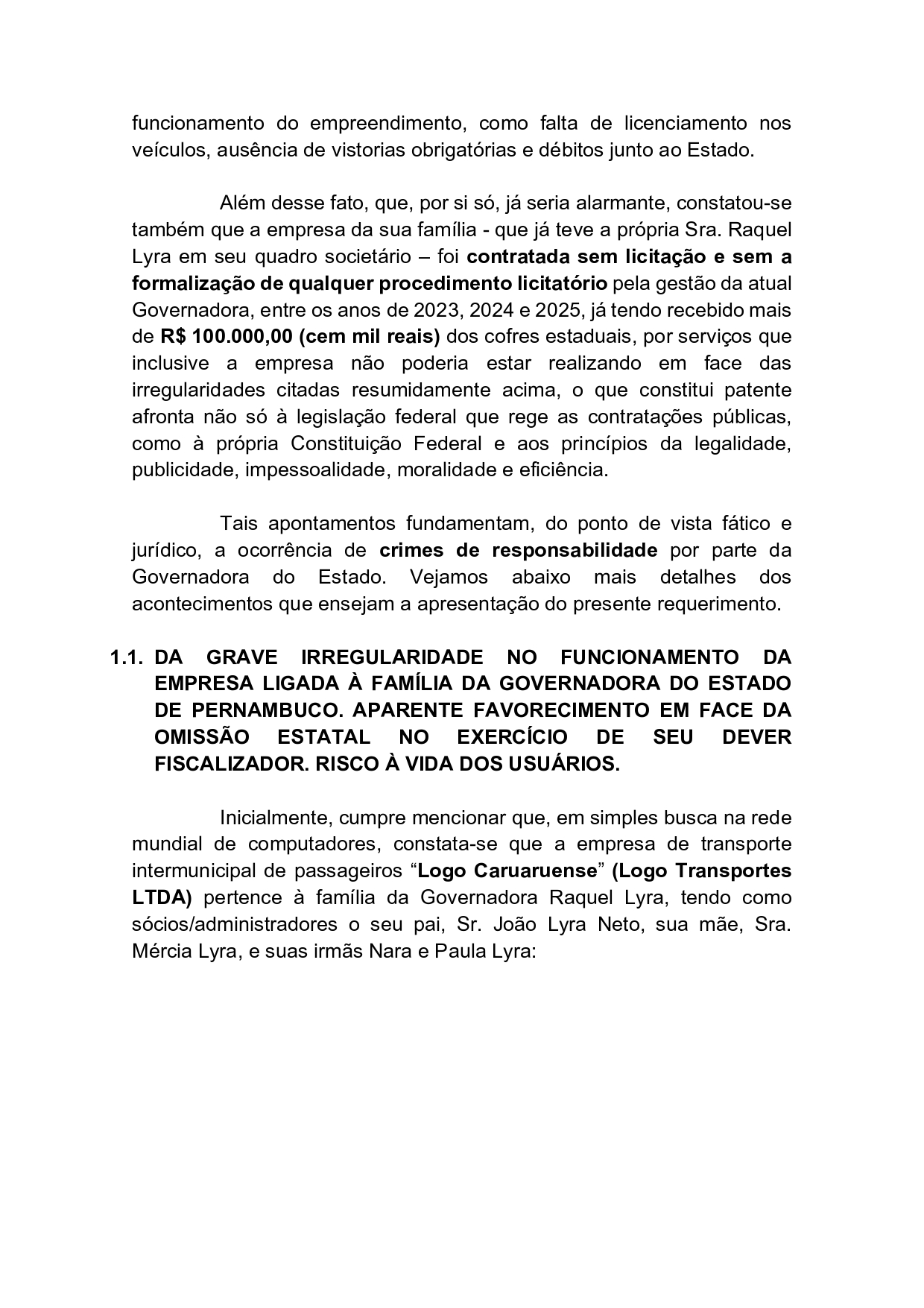 O pedido se deveu às denúncias de falta de fiscalização da empresa de ônibus do pai da governadora, o ex-governador João Lyra, a Logo Caruaruense, fechada na sexta-feira (16). Romero Albuquerque, também oposição ao governo, justifica o pedido de impeachment por favorecimento, prevaricação e advogacia administrativa.