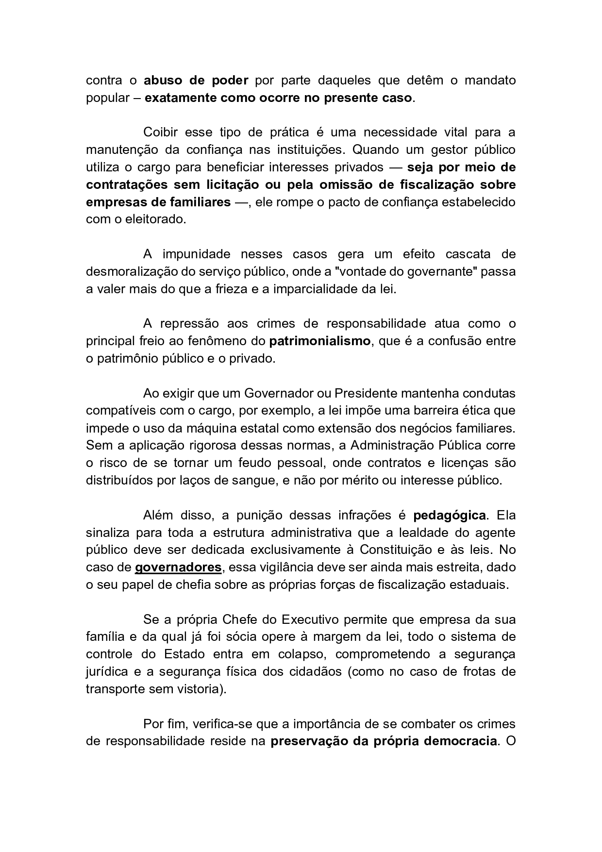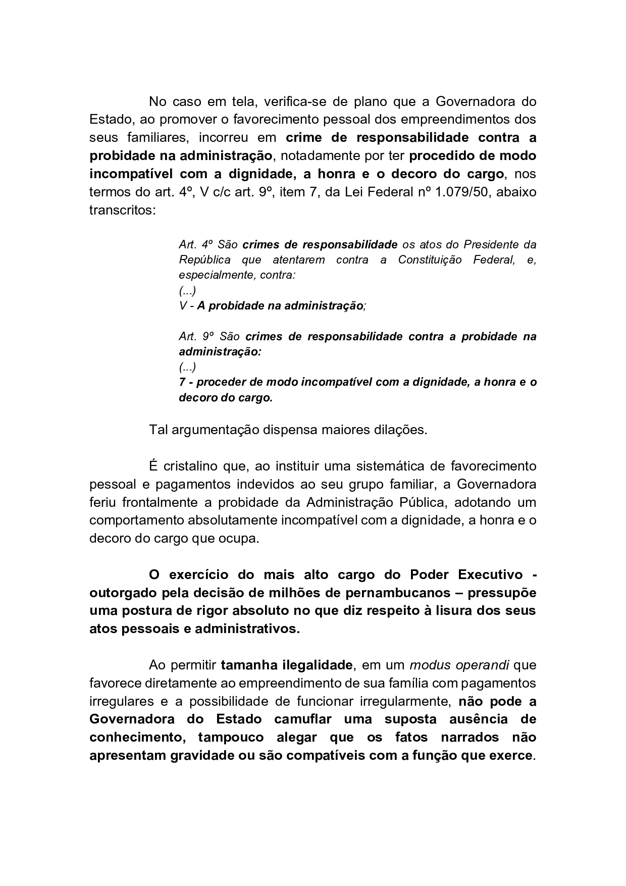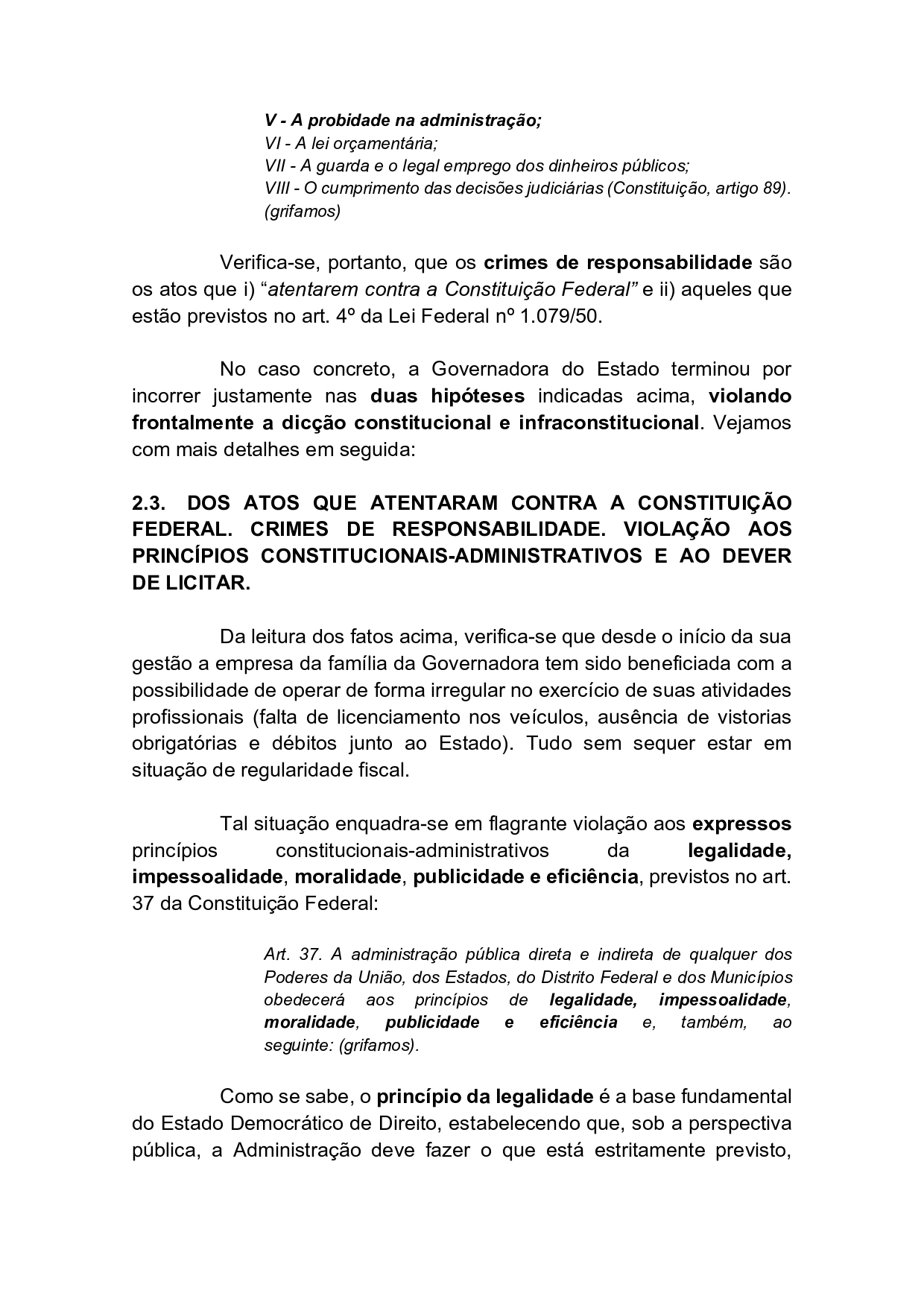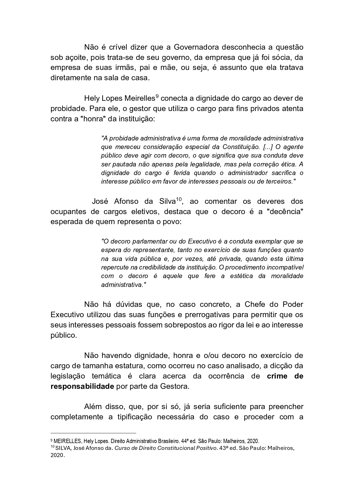 “O governo favoreceu deliberadamente uma empresa ligada à família da governadora, fechando os olhos para as irregularidades. Isso é prevaricação, quando o agente público deixa de cumprir seu dever para atender a interesses pessoais. Também se configura advocacia administrativa, quando a autoridade usa sua influência para beneficiar alguém. Eles sabiam o que estavam fazendo, ou deixando de fazer”, declarou ele no anúncio do pedido de impeachment.