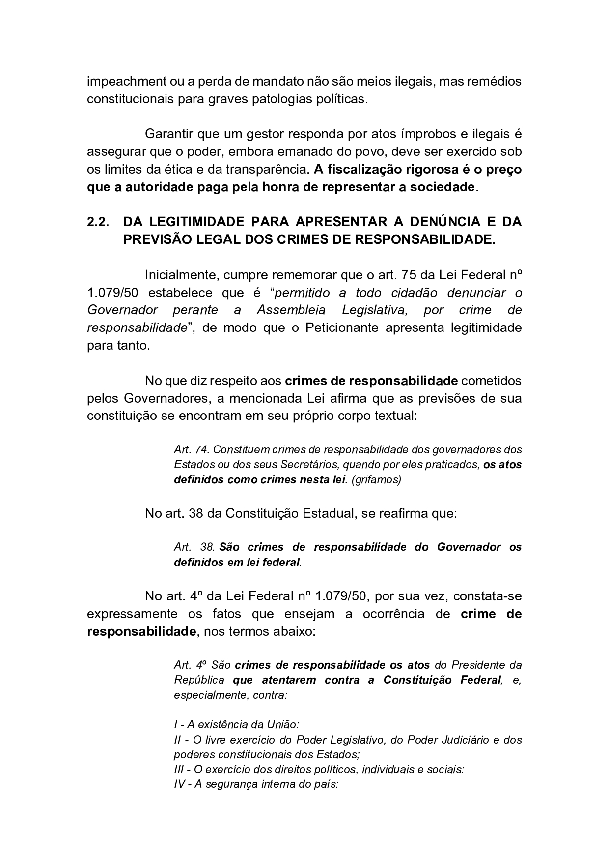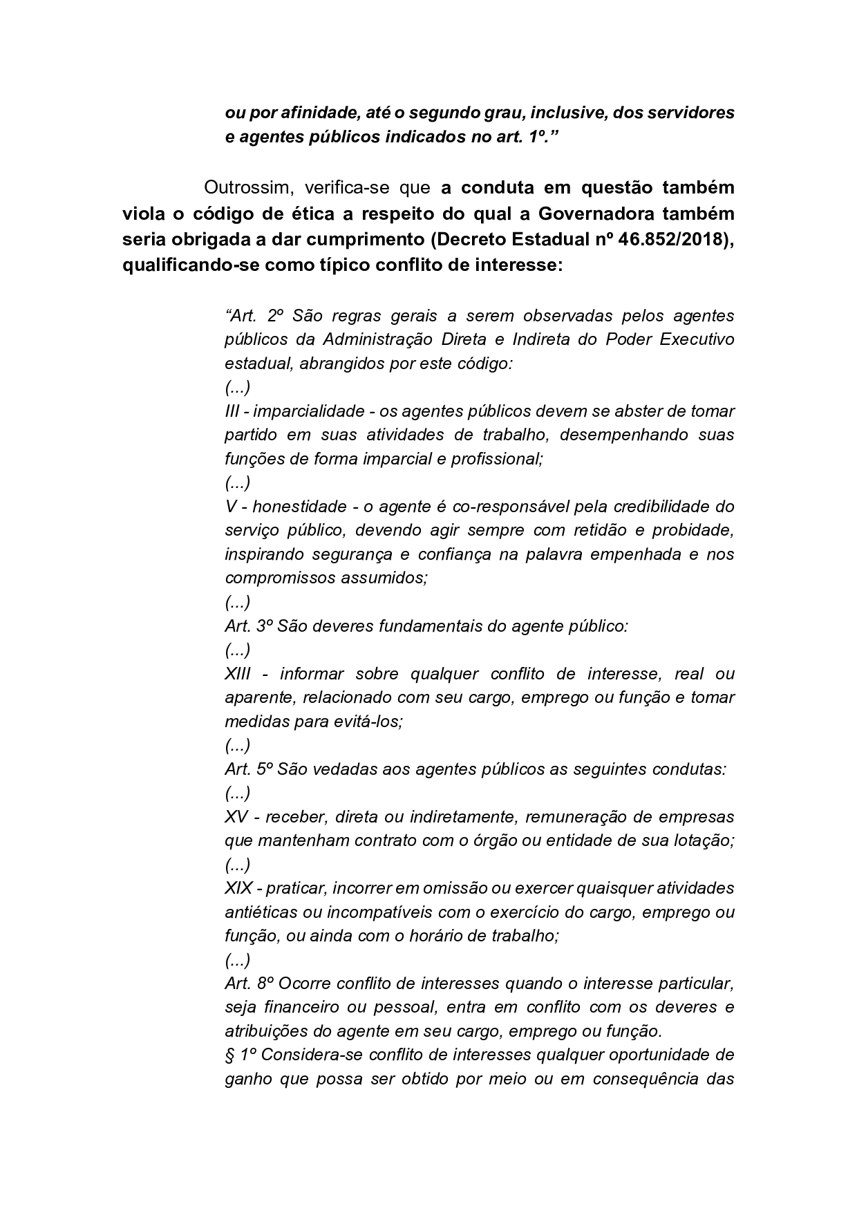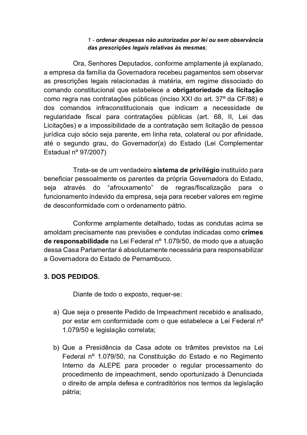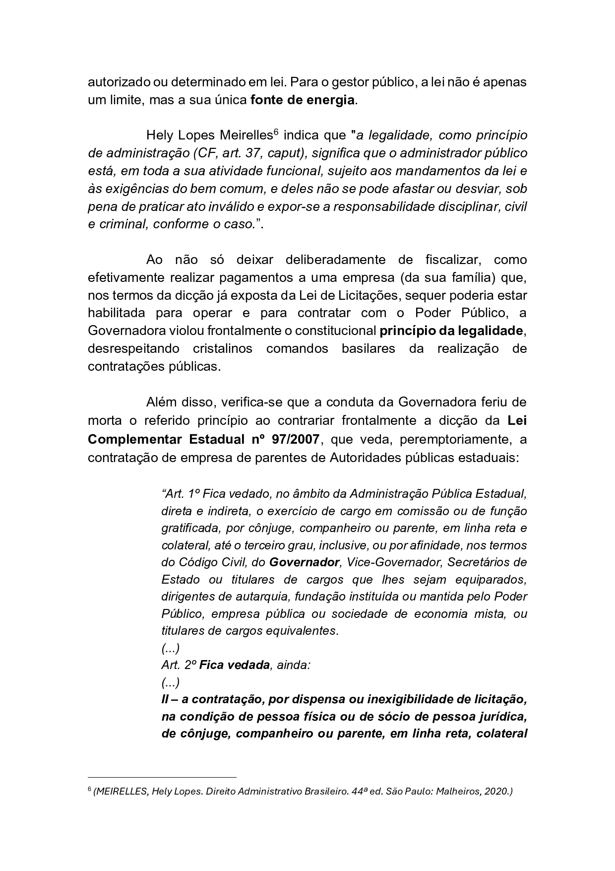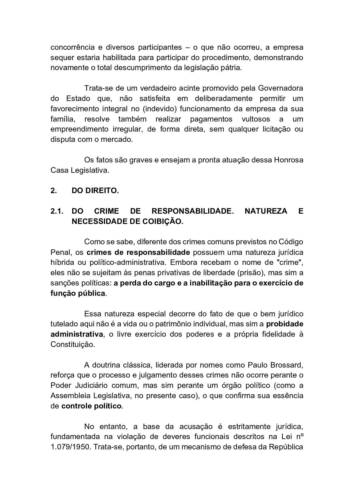 “O governo favoreceu deliberadamente uma empresa ligada à família da governadora, fechando os olhos para as irregularidades. Isso é prevaricação, quando o agente público deixa de cumprir seu dever para atender a interesses pessoais. Também se configura advocacia administrativa, quando a autoridade usa sua influência para beneficiar alguém. Eles sabiam o que estavam fazendo, ou deixando de fazer”, declarou ele no anúncio do pedido de impeachment.