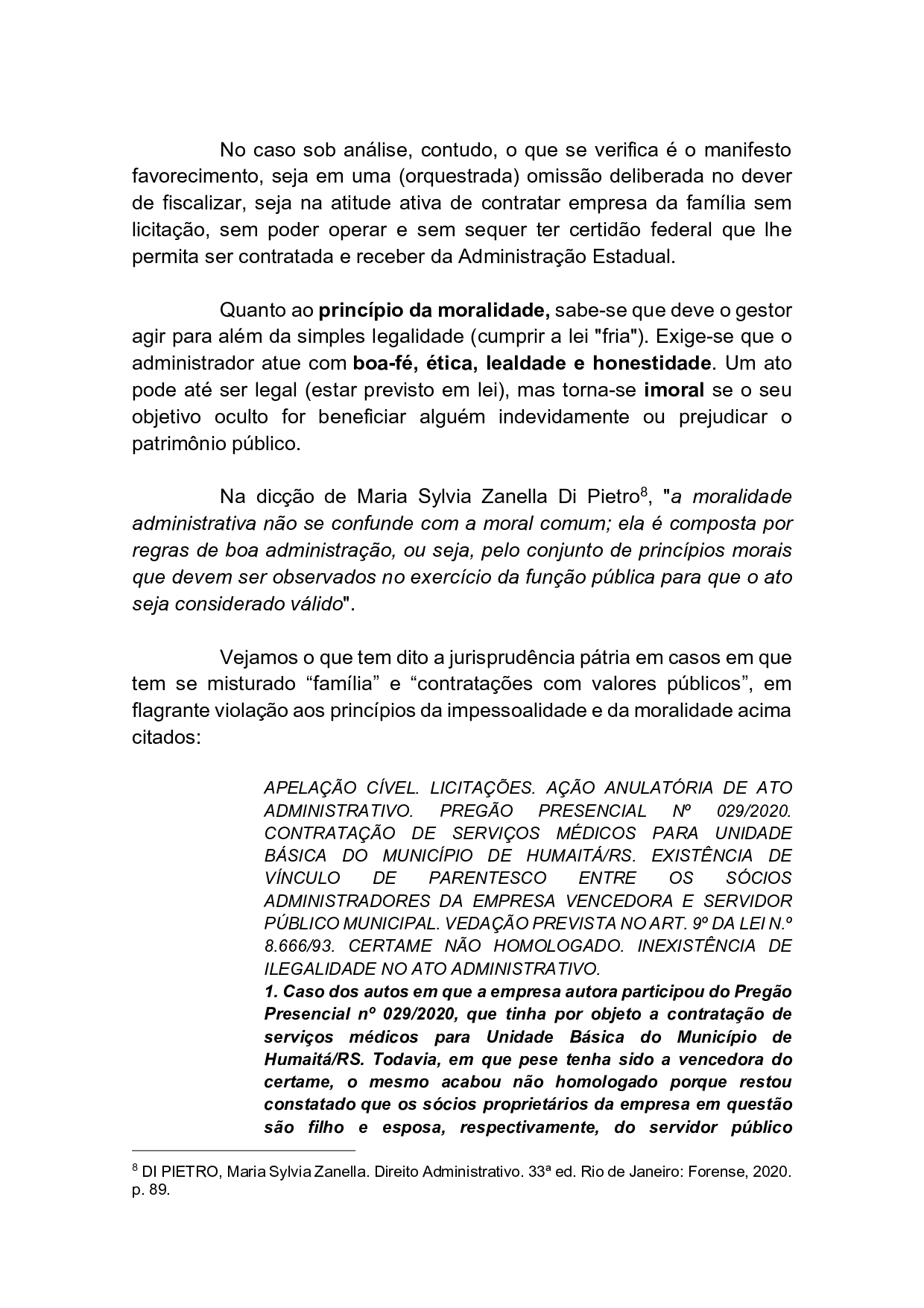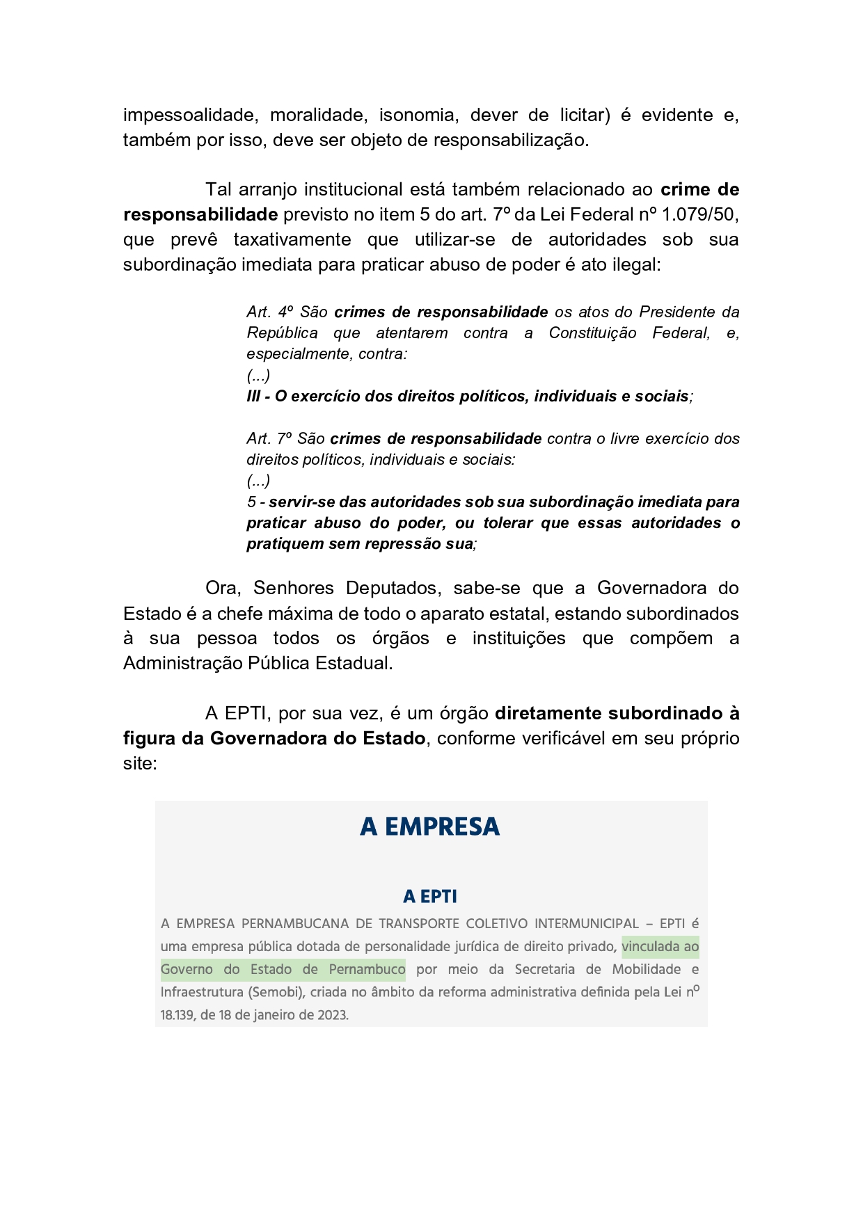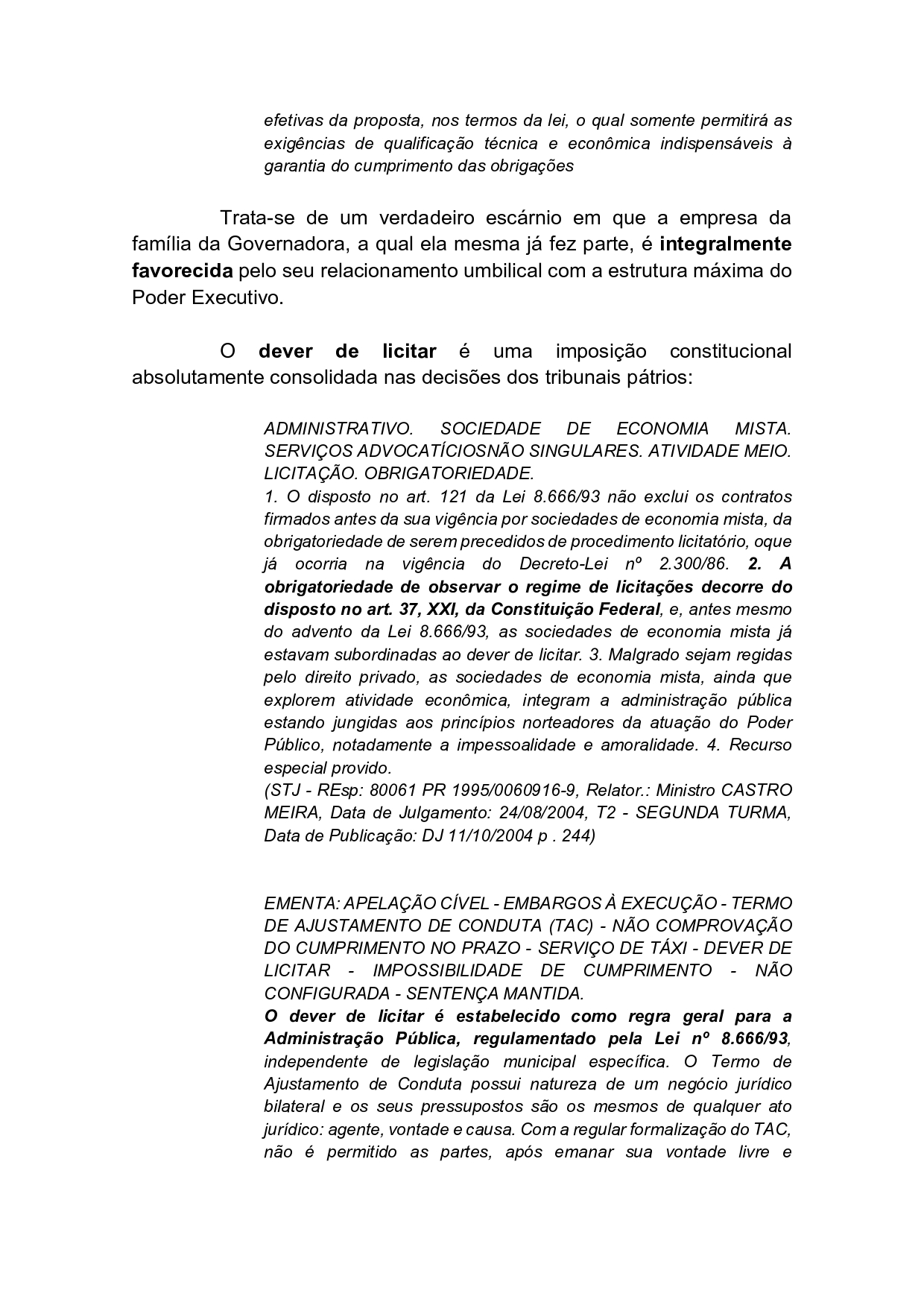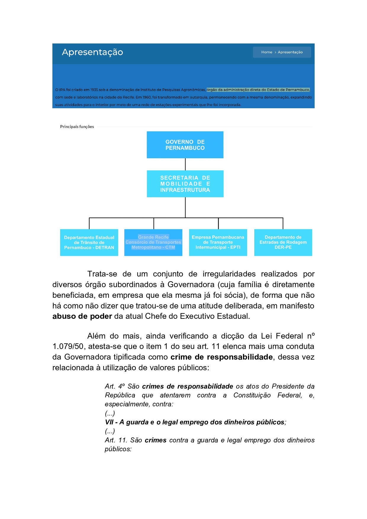 “O governo favoreceu deliberadamente uma empresa ligada à família da governadora, fechando os olhos para as irregularidades. Isso é prevaricação, quando o agente público deixa de cumprir seu dever para atender a interesses pessoais. Também se configura advocacia administrativa, quando a autoridade usa sua influência para beneficiar alguém. Eles sabiam o que estavam fazendo, ou deixando de fazer”, declarou ele no anúncio do pedido de impeachment.