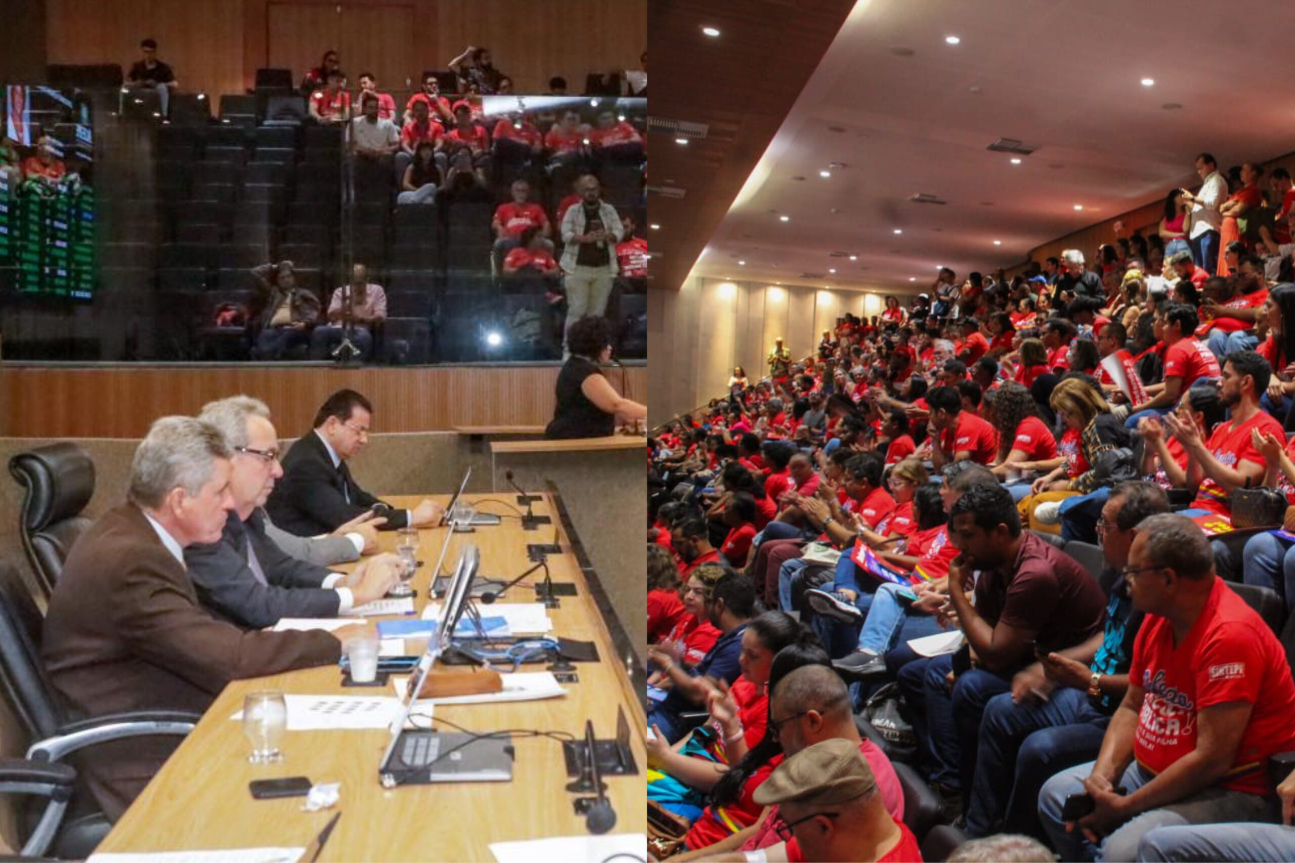 Os professores estavam nas galerias da Alepe e protestaram contra a demora para a votação, pois os deputados discutiam em plenário os vetos da governadora Raquel Lyra (PSD) à Lei Orçamentária Anual (LOA) e também o projeto que previa mudança no percentual de remanejamento orçamentário.