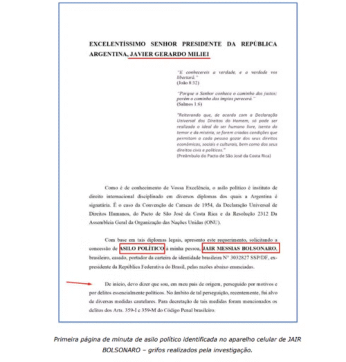 “O conteúdo revela que JAIR MESSIAS BOLSONARO praticou atos para obter asilo político na Argentina. Embora se trate de um único documento em formato editável, sem data e assinatura, seu teor revela que o réu, desde a deflagração da operação Tempus Veritatis, planejou atos para fugir do país, com o objetivo de impedir a aplicação de lei penal. Trata-se do arquivo Carta JAIR MESSIAS BOLSONARO.docx, o qual, conforme seus metadados, foi salvo no celular do ex-Presidente no dia 10/02/2024 às 18h28min”, diz a PF.