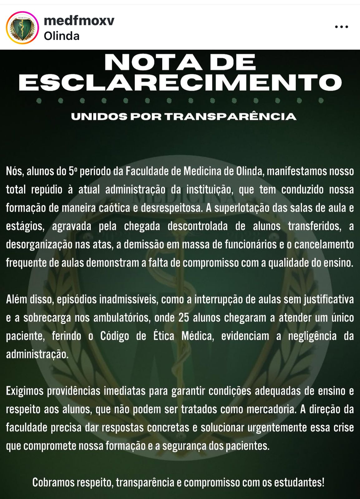 “Nós, alunos da Faculdade de Medicina de Olinda, manifestamos, por meio deste documento, nossa profunda insatisfação com a atual administração da instituição. O cenário que enfrentamos é de caos, desorganização e desrespeito com nossa formação acadêmica e profissional.