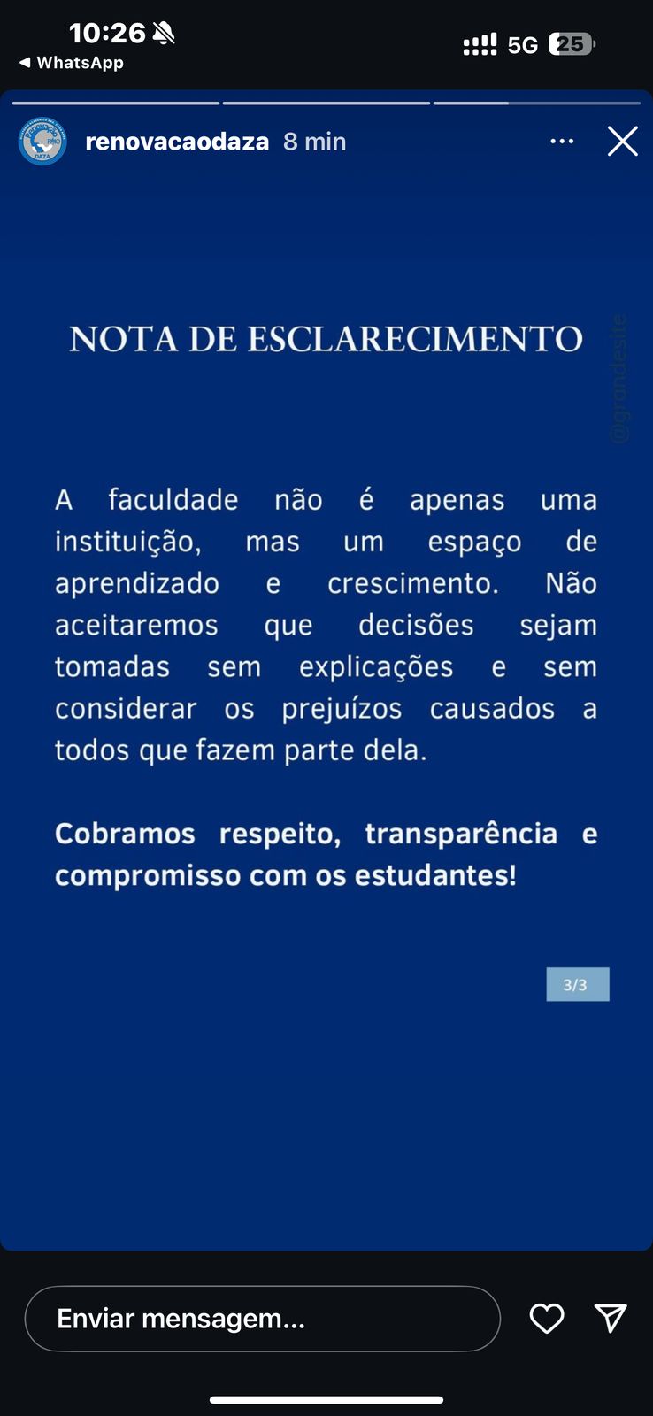 Diante desse cenário, exigimos providências imediatas e total transparência da administração da faculdade. Nossa formação está em risco, e não aceitaremos que a educação médica seja tratada com tamanho descaso”.