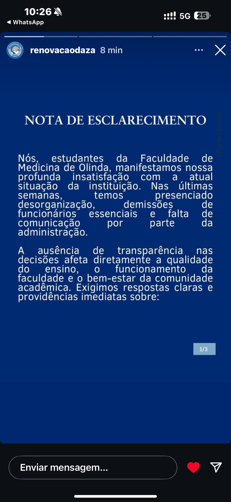 “Nós, alunos da Faculdade de Medicina de Olinda, manifestamos, por meio deste documento, nossa profunda insatisfação com a atual administração da instituição. O cenário que enfrentamos é de caos, desorganização e desrespeito com nossa formação acadêmica e profissional.