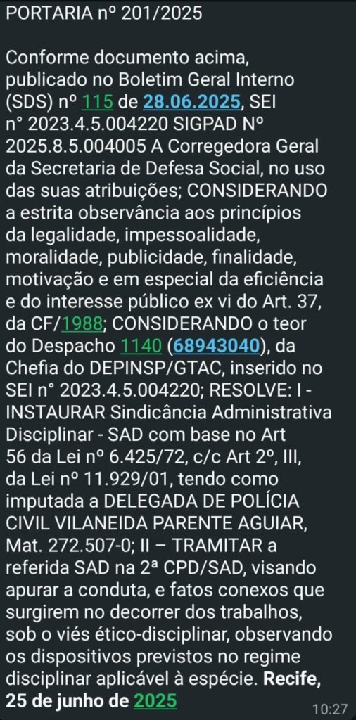 EXCLUSIVO, por André Beltrão – Colegas da diretora-geral adjunta da Polícia Civil, Beatriz Leite, rebatem a denúncia de que estaria perseguindo a delegada Vilaneida Aguiar. Dizem que a acusadora sofre processo administrativo por haver recusado atendimento a uma vítima de abuso sexual e usa as funções com pretensões políticas, tendo sido candidata à vereadora em 2024 e em 2020.