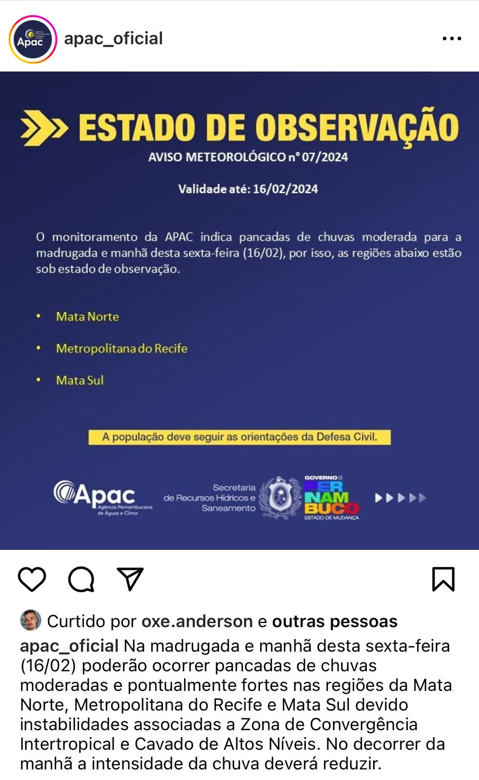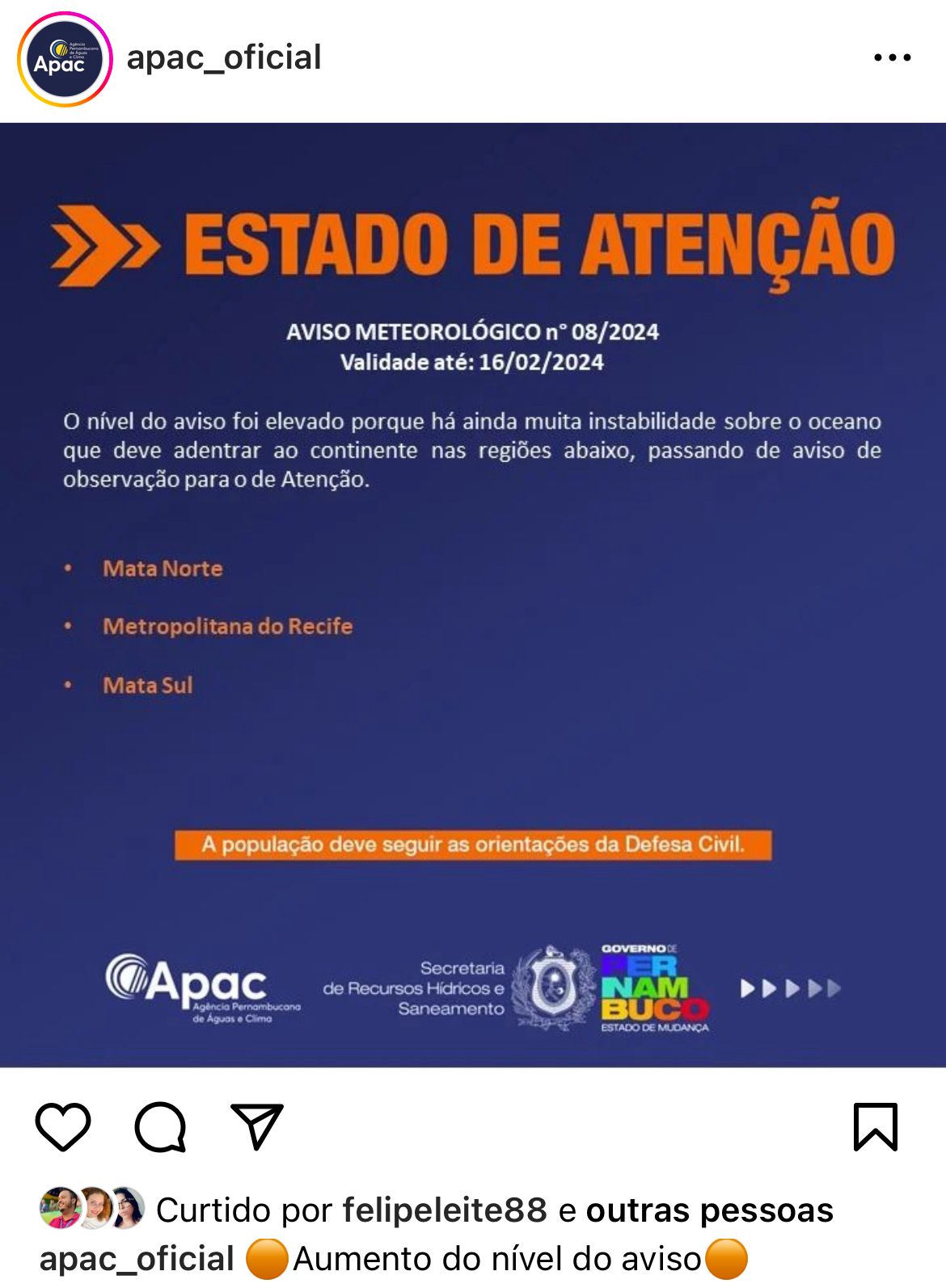 O segundo alerta da APAC, publicado nas redes sociais, só foi emitido uma hora depois, com a indicação de elevação do nível de aviso para laranja: “O nível do aviso foi elevado porque há ainda muita instabilidade sobre o oceano que deve adentrar ao continente nas regiões abaixo, passando de aviso de observação para o de Atenção”.