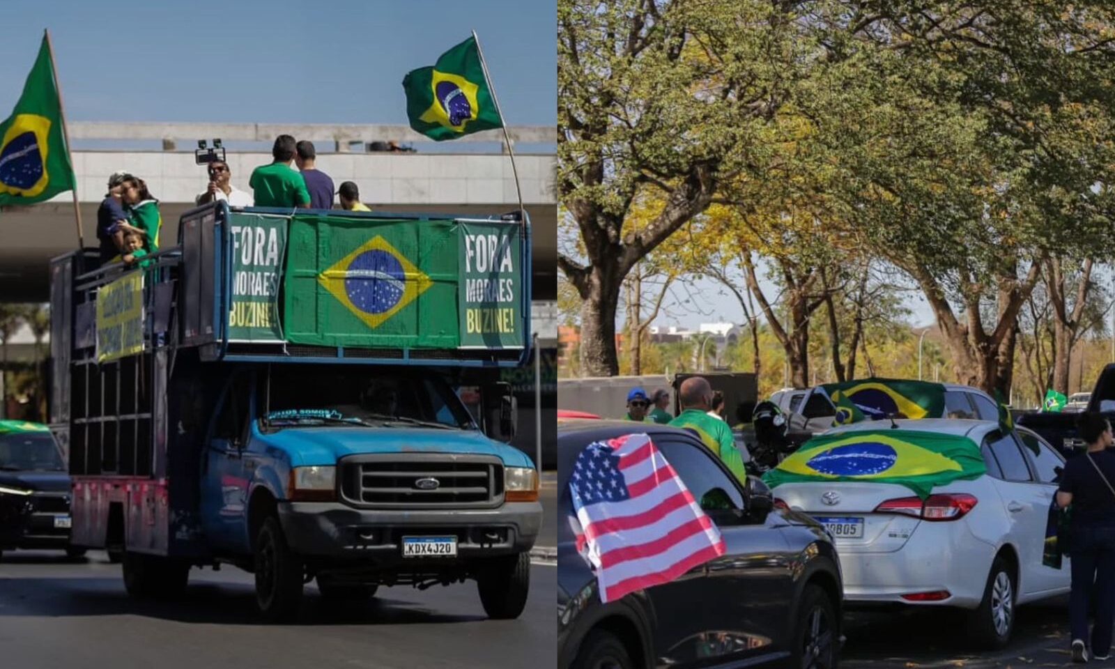 Durante o ato, foram erguidas bandeiras do Brasil, dos Estados Unidos e de Israel, além de cartazes com frases como “Fora Lula”, “Fora Moraes, buzine!” e “Anistia já”. O grupo partiu em direção ao condomínio Solar de Brasília, onde Bolsonaro cumpre prisão domiciliar, por volta das 10h20.