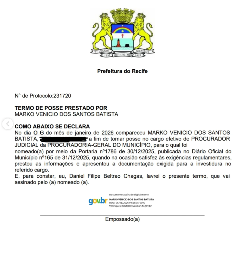Da Redação do Blog – Depois de mais de dois anos de espera e de uma reviravolta que sacudiu os bastidores do Palácio do Capibaribe, Marko Vinicio dos Santos Batista tomou posse nesta terça-feira (06/01) como Procurador Judicial do Recife. A nomeação marca o desfecho de um episódio que ganhou forte repercussão após a Prefeitura voltar atrás em uma mudança no resultado do concurso da PGM.