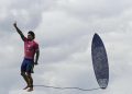 Medina 'no ar' durante eliminatórias do surfe na Olimpíada (Jerome Brouillet/AFP)