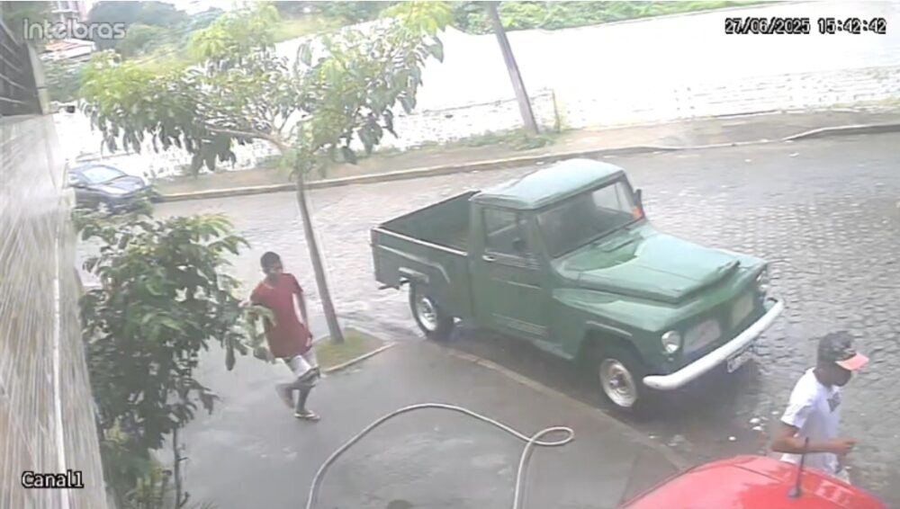 Os três bandidos descem do Gol e um deles, revólver na mão, aborda o morador e toma as chaves do carro e seu celular. Dois retornam ao Gol e dão partida e um terceiro arranca com o veículo da vítima.