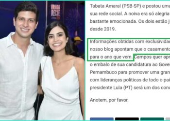 Por Ricardo Antunes — Agora é oficial: o prefeito do Recife, João Campos (PSB-PE), e a deputada federal Tabata Amaral...