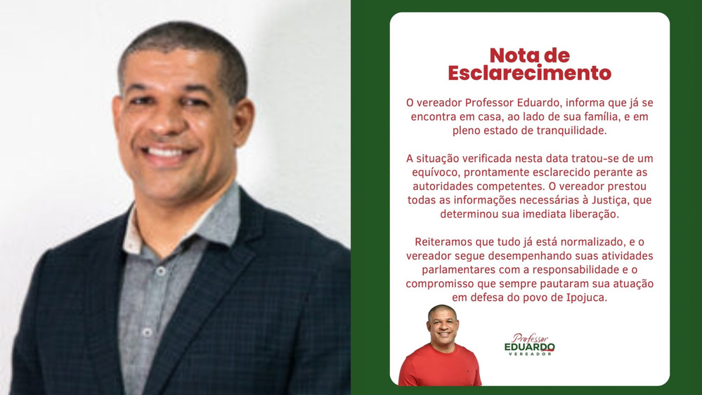 Ele divulgou nota nas redes sociais na qual anuncia que está em casa, com a família, “em pleno estado de tranquilidade”. O vereador, sua mulher, a contadora Wilka Magalhães, e as três filhas moram em Nossa Senhora do Ó, distrito de Ipojuca. Eduardo Cleiton de Santana, 42 anos, classificou de “equívoco” sua prisão, que disse ter sido “prontamente esclarecido perante as autoridades competentes”.