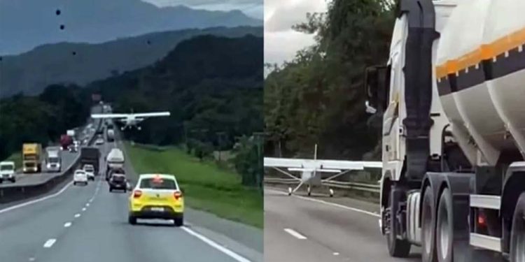 Vídeo feito por ocupantes de um veículo mostra o avião de pequeno porte pousando em meio a carros e caminhões. Ele não colidiu com nenhum veículo.