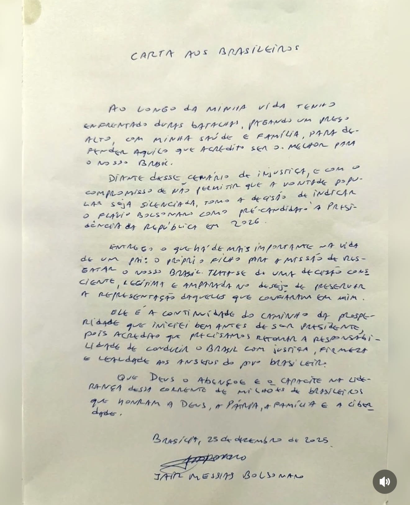 “Ao longo da minha vida tenho enfrentado duras batalhas, pagando um preço alto, com minha saúde e família, para defender aquilo que acredito ser o melhor para o nosso Brasil”, inicia Bolsonaro na carta, que foi lida por Flávio para jornalistas. “Diante desse cenário de injustiça, e com o compromisso de não permitir que a vontade popular seja silenciada, tomo a decisão de indicar o Flávio Bolsonaro como pré-candidato à Presidência da República em 2026”, segue ele.