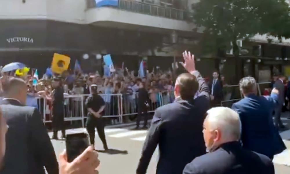 Em transmissão da Televisión Pública argentina, Bolsonaro aparece sorrindo, com seguranças ao redor, enquanto levanta as mãos com gestos de “vitória” e entra na Assembleia Legislativa do país vizinho, para início das formalidades de posse.