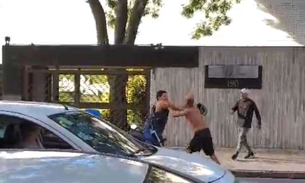 A troca de acusações virou agressão quando o motociclista, já sem camisa, acertou o outro com o capacete e emendou uma sequência de socos no rosto. Os dois se atracaram no meio da rua até que três moradores intervieram para separar a briga.