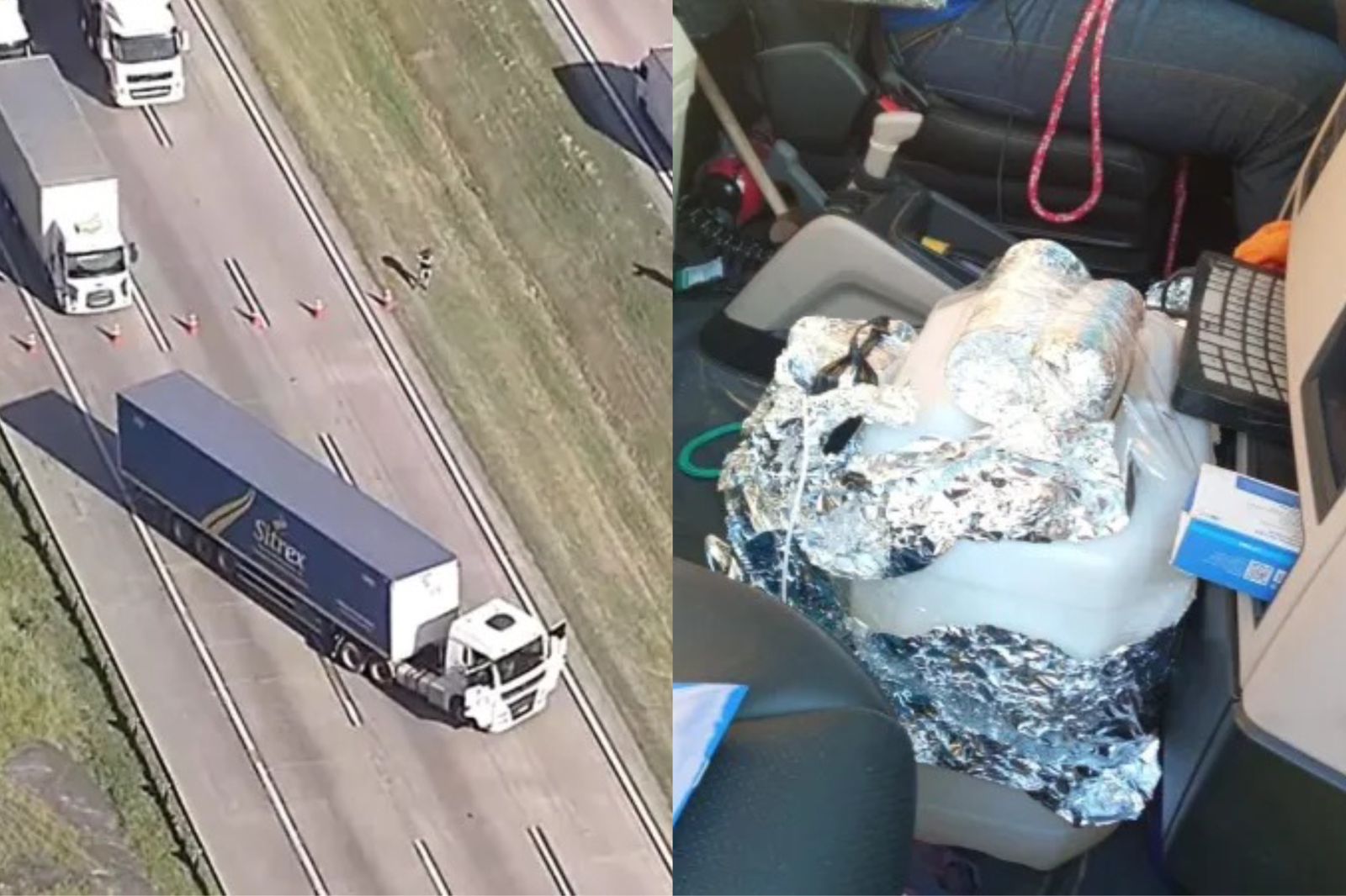 Suposta bomba colocada ao lado do homem tem formato de cilindro, está enrolada em papel alumínio e em cima de um galão. Uma imagem à qual o UOLteve acesso mostra que ao menos três volumes diferentes estão presos ao galão na cabine do caminhão. Um fio liga o artefato caseiro ao motorista.