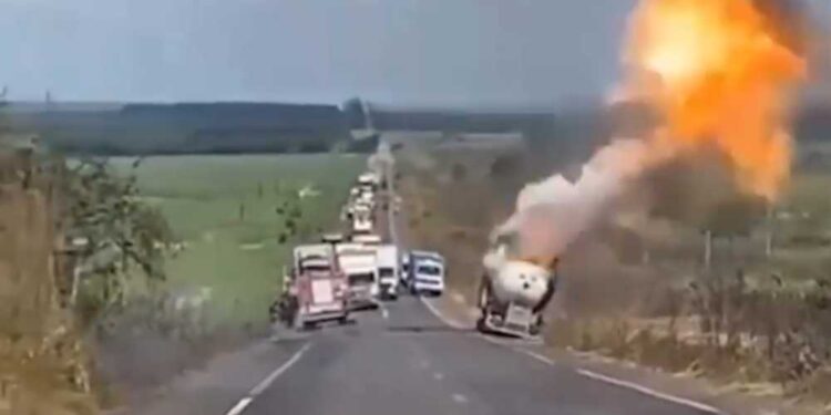 Após a explosão, o caminhão-tanque ficou completamente destruído. Ninguém morreu no acidente.