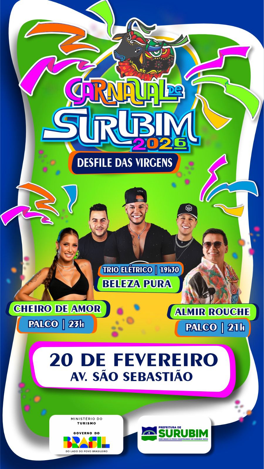 O festejo começa a partir das 19h30 na sexta-feira (20), na Avenida São Sebastião, seguindo até o Pátio da Usina. Entre os nomes confirmados estão João Gomes, Psirico, Almir Rouche, Marrom Brasileiro e Parangolé. Haverá apresentações de trio elétrico e no palco.
