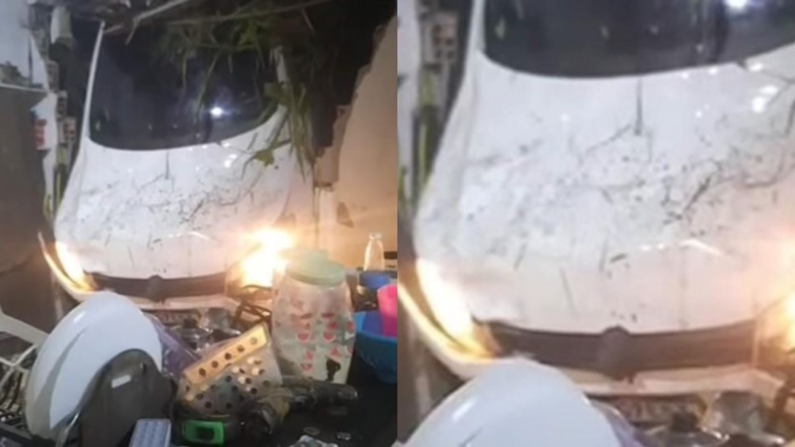 Apesar do susto e dos danos materiais, ninguém ficou ferido. Imagens do acidente mostram o veículo pendurado de ponta-cabeça na parede, ainda com o farol acesso. Também é possível ver muitos destroços e itens de cozinha pelo chão.