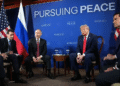 Esta frase também está estampada no painel da sala onde os chefes de Estado estão fazendo a reunião bilateral. Outras autoridades estão presentes no encontro, como Marco Rubio, chefe da diplomacia americana, e Sergei Lavrov, chanceler russo.