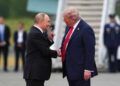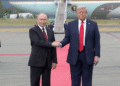 Os dois líderes desembarcaram no Alasca pouco tempo antes do início da reunião. Trump foi visto aplaudindo enquanto Putin se aproximava. Ambos apertaram as mãos e seguiram em um tapete vermelho até um palco com o letreiro “Alasca 2025”.