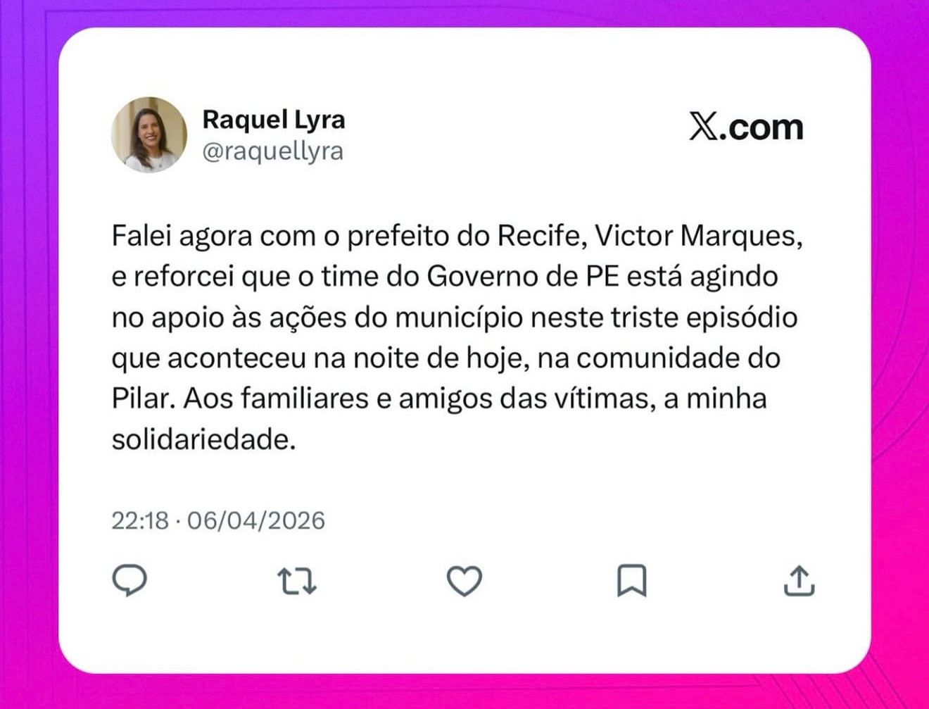 Outras duas pessoas, um homem de 31 anos e uma mulher de 27, foram encaminhadas ao Hospital da Restauração, no bairro do Derby, também na área central da capital pernambucana. Até a última atualização desta reportagem, os nomes das vítimas e o estado de saúde delas não foram divulgados.