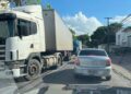Com os caminhões estacionados, apenas uma via fica disponível para o tráfego, resultando em congestionamentos e atrasos para os motoristas que necessitam utilizar essa importante rota de acesso em Boa Viagem.