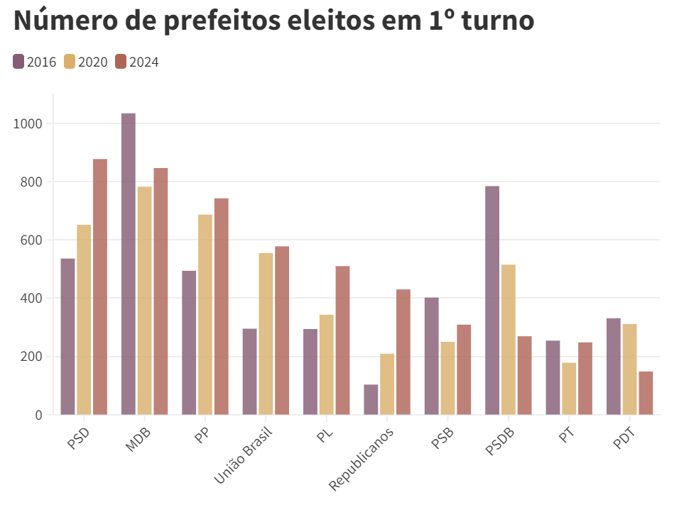 O maior aumento foi do PSD, de 35%. O MDB e o PP subiram 8%. Já o União Brasil disputou sua primeira eleição este ano. Foi criado em 2021 pela junção do DEM com o PSL. Considerando o resultado desses dois partidos nas eleições 2020, a alta do União Brasil em 2024 foi de 4%.