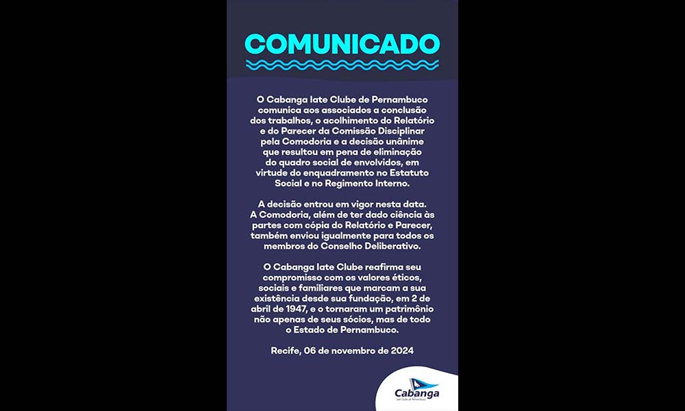 Na decisão do Cabanga, consta que “após o parecer produzido pela Comissão Disciplinar” e com base nas “disposições contidas no documento” foi decidido absolver o associado Fernando da Fonte, determinando a consequente “revogação da suspensão cautelar de seu acesso ao Clube”.