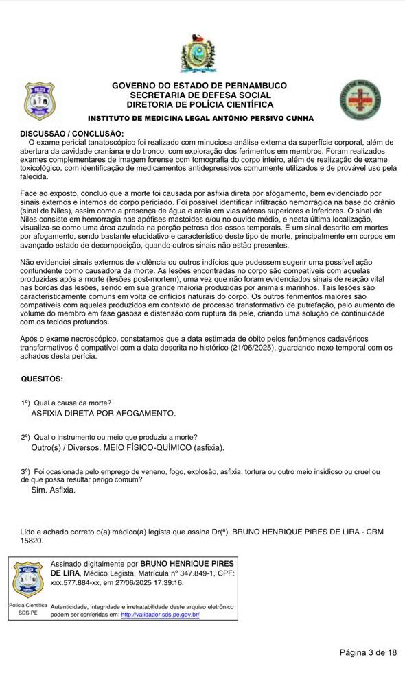Assinado pelo legista Bruno Henrique de Lima, descreve o laudo: “Não há sinais externos de violência ou outros indícios que pudessem sugerir uma possível ação contundente como causadora da morte”.