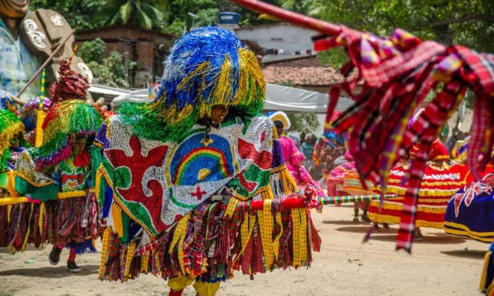 Hoje, o cortejo é um teatro popular em movimento. O caboclo de lança é o símbolo mais reconhecido, com sua gola bordada, cabeleira de tiras reluzentes e a lança enfeitada que abre caminho na multidão. Mas ele não está sozinho. Desfilam o mestre do apito, que comanda o ritmo e improvisa poesia; o rei e a rainha; a dama do paço; o arreiamá; as baianas e outros personagens que dão forma a essa dramaturgia coletiva.