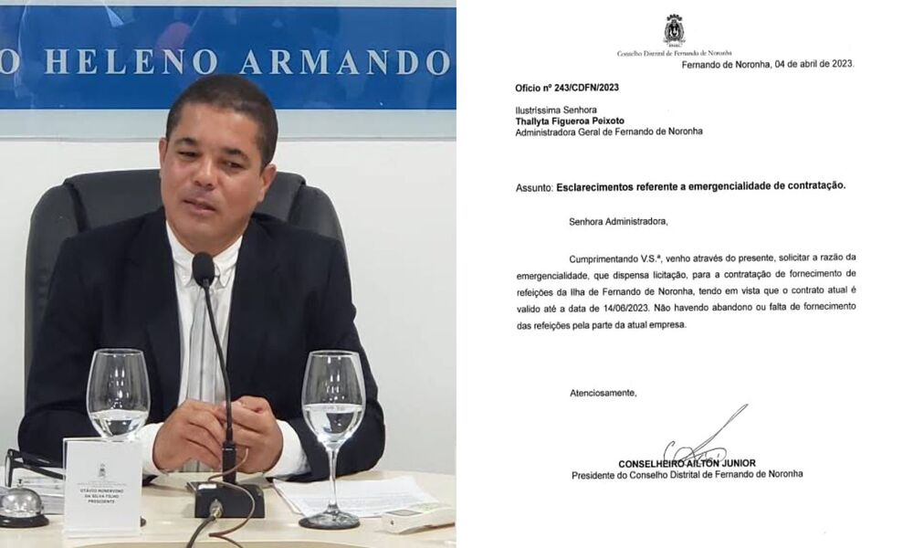 Da Redação do Blog – De forma inusitada, e revelando abertamente vinculações com a empresa FR Eventos, Locações e Serviços, o presidente do Conselho Distrital de Fernando de Noronha, Ailton Junior, enviou um ofício para a Administradora da Ilha, Thallyta Figuerôa, pedindo explicações sobre a licitação emergencial para fornecimento de alimentos publicada nessa terça (04), no Diário Oficial do Estado.