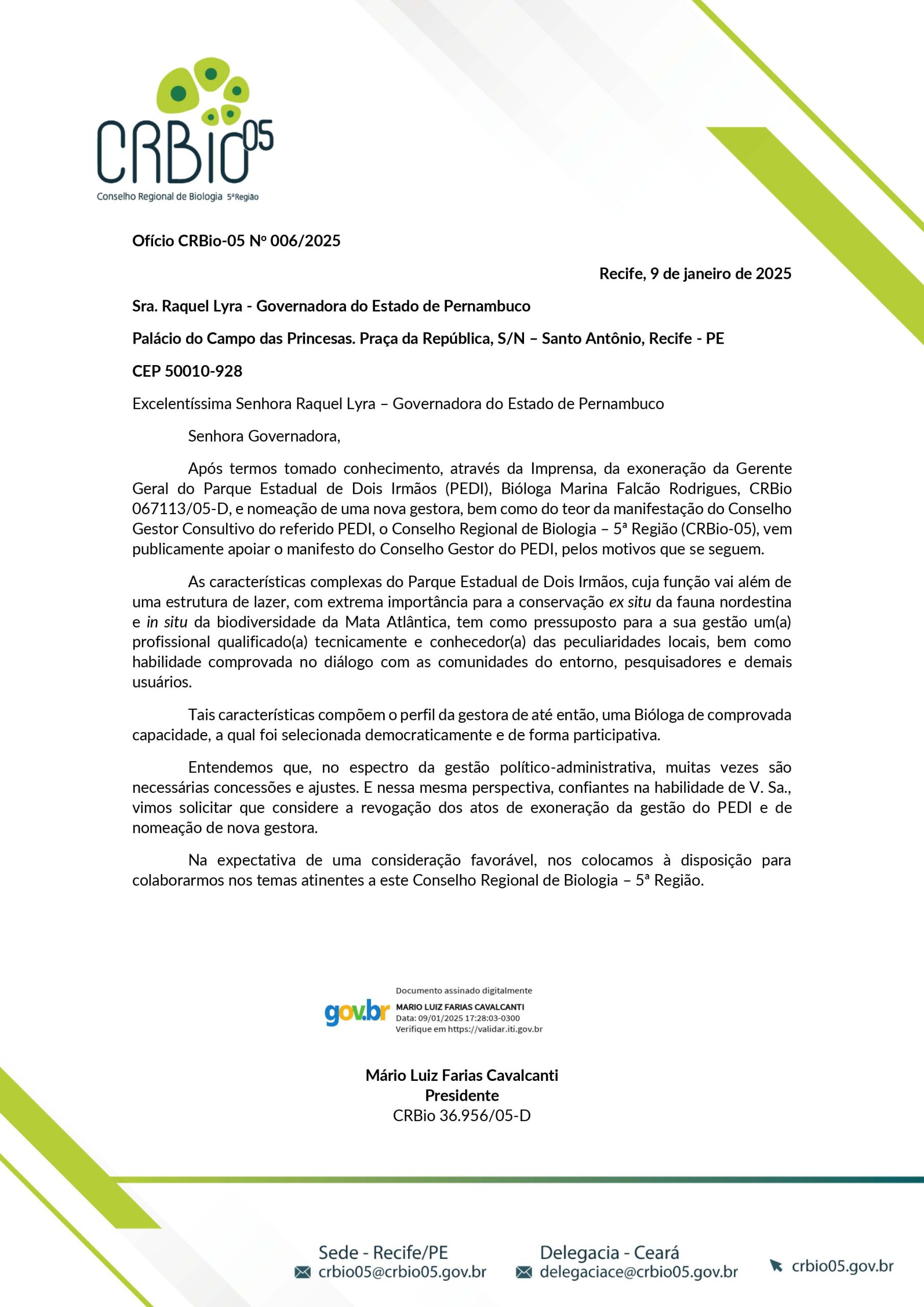 Da Redação do Blog — O Conselho Regional de Biologia da 5ª Região (CRBio-05), através do presidente Mário Cavalcanti, solicitou à governadora de Pernambuco, Raquel Lyra, a reconsideração do afastamento da Bióloga Marina Falcão do cargo de Gestora do Parque Estadual de Dois Irmãos (PEDI).
