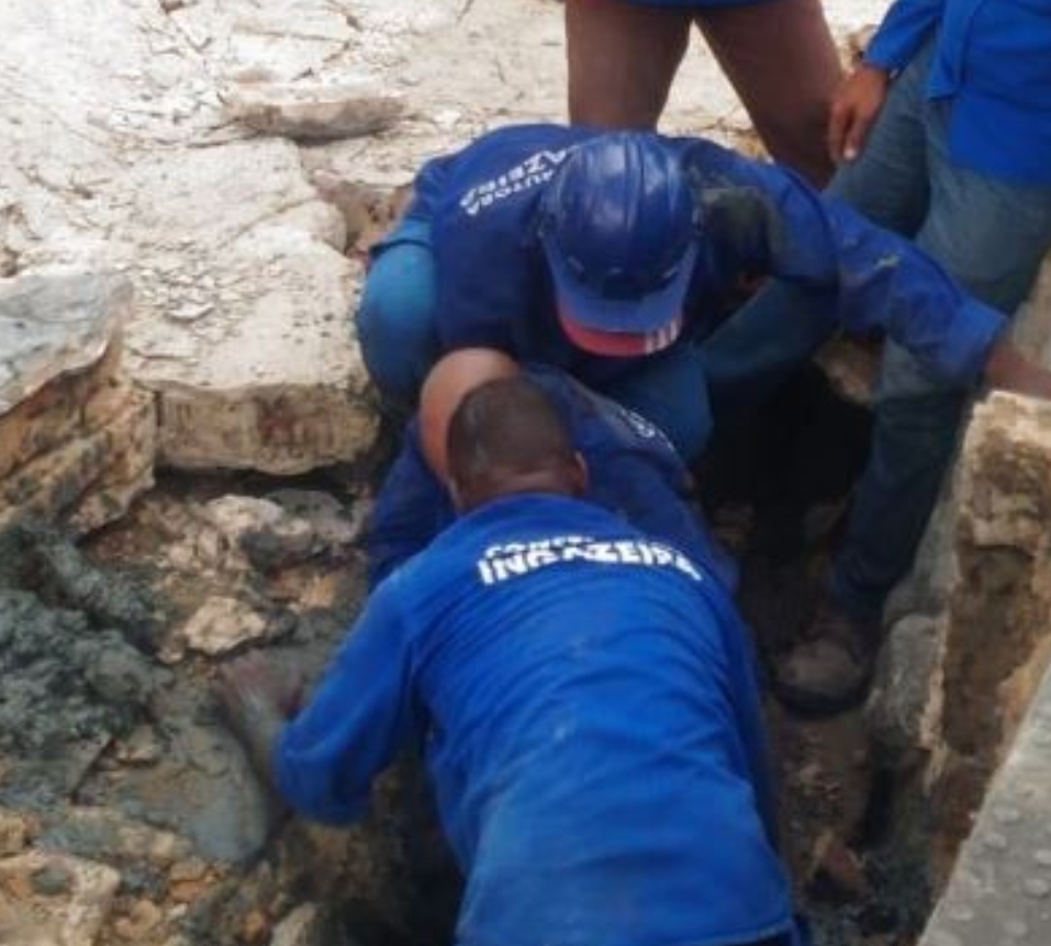 Foto de trabalhadores resgatando colega acidentado em ovra da Ingazeira com a Prefeitura do Recife