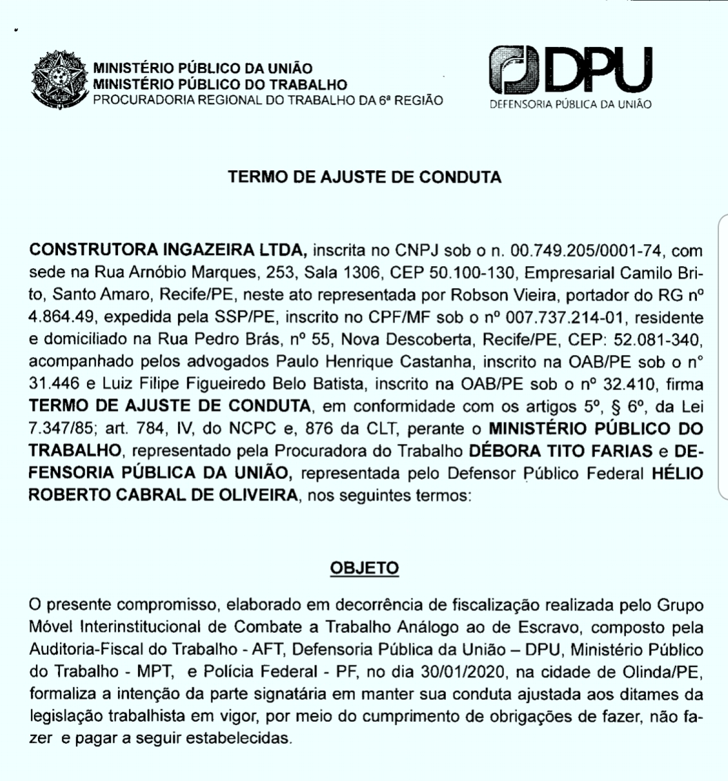 O Blog teve acesso ao Termo de Ajustamento de Conduta firmado entre o MPT, a DPU e a empresa Ingazeira, firmado no dia 6 de fevereiro e constatou que em razão das irregularidades encontradas e de modo a evitar implicações penais, a Construtora se comprometeu a pagar as verbas rescisórias doa empregados, além de danos morais arbitrados em dois mil reais para cada um dos Trabalhadores da obra fiscalizada.