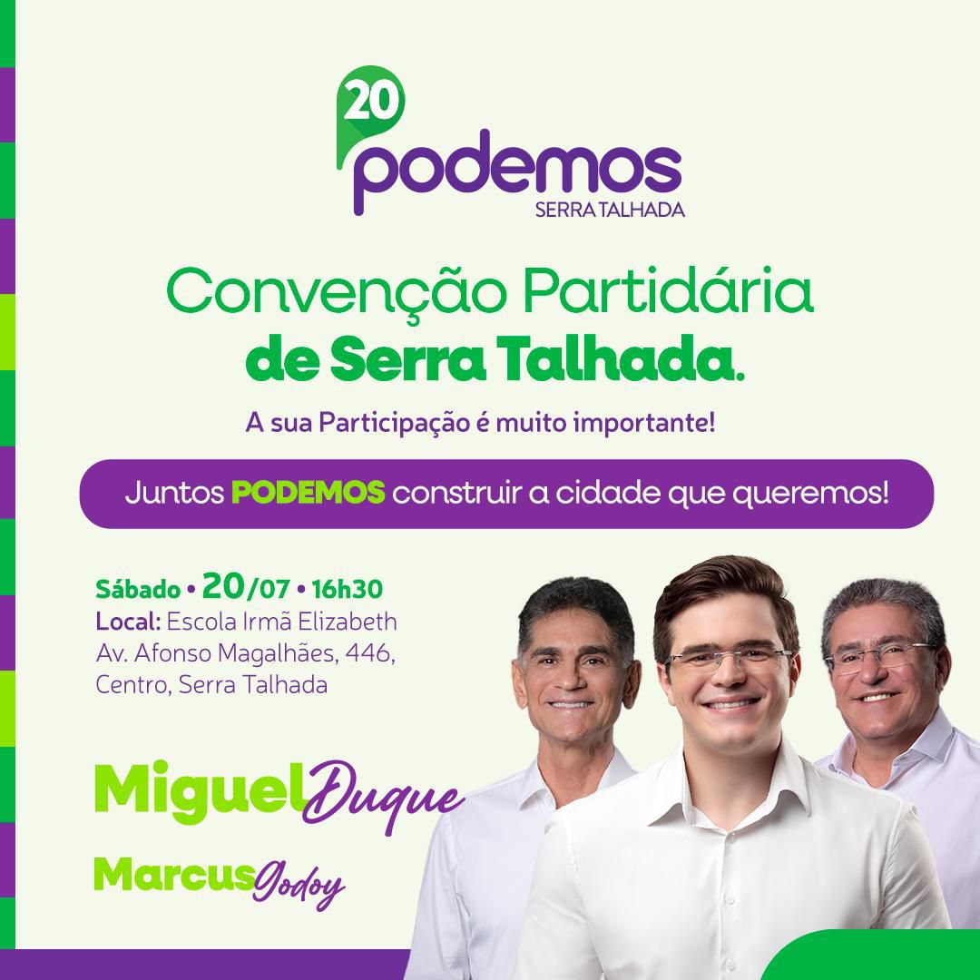 Da Redação do Blog – O deputado estadual Luciano Duque convida a todos para a convenção partidária do Podemos, amanhã (20), às 16h, na Escola Miranda Elisabeth. O evento vai lançar a pré-candidatura de Miguel Duque a prefeito de Serra Talhada e seu vice, Marcos Godoy.
