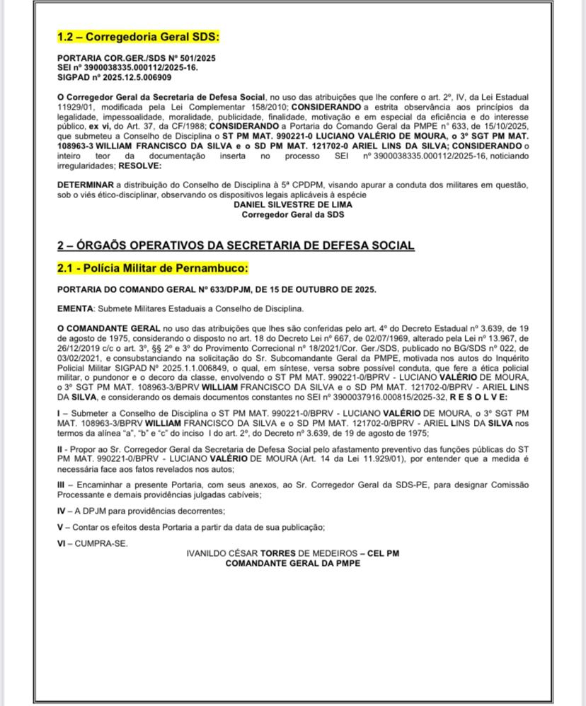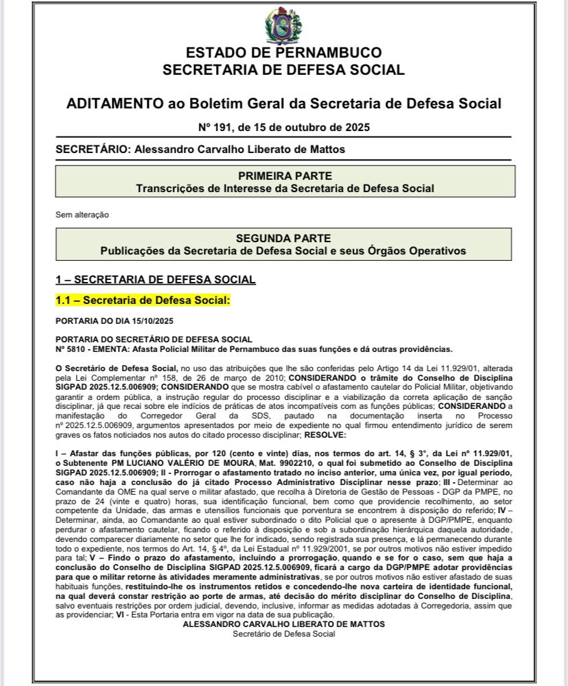 O processo disciplinar registrado sob o SIGPAD nº 2025.12.5.006909 tem o prazo de 120 dias para ser concluído, prorrogável por igual período, durante o qual o subtenente Luciano Valério de Moura ficará afastado de suas funções.