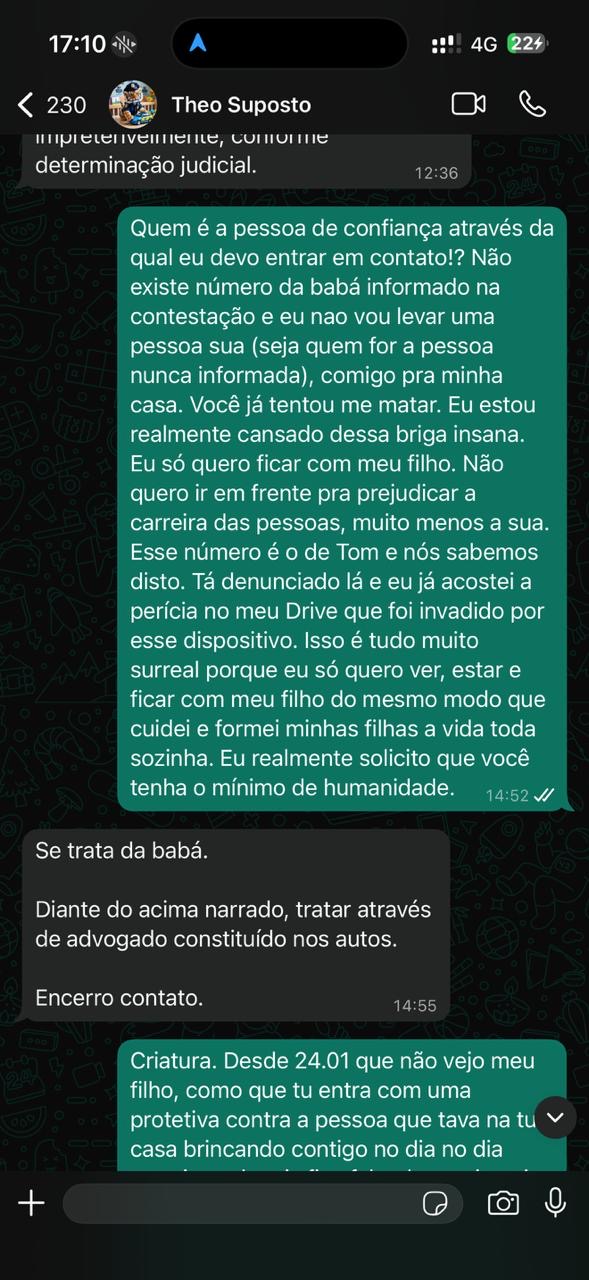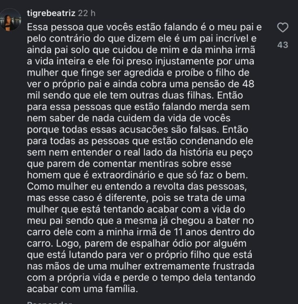 A nota também levanta questionamentos sobre a conduta da genitora da criança, Maria Cecilia Brito, citando histórico de litígios judiciais e possíveis irregularidades funcionais, além de alegar alienação parental. Em um print a que o blog teve acesso, Tigre reclama à ex-companheira que ele quer ter mais contato com o filho, que não vê desde 24 de janeiro de 2024: “tenha o mínimo de humanidade”, escreve.