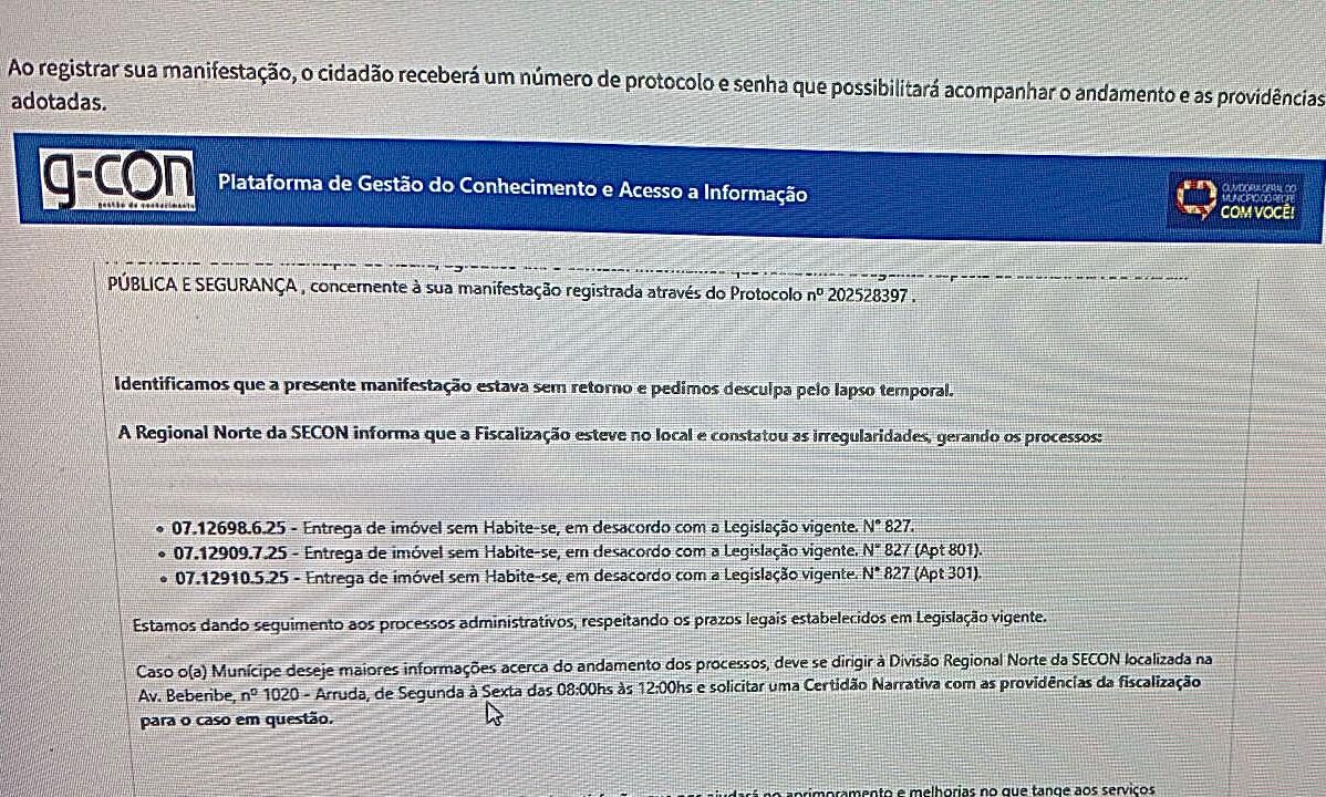A abertura dos três processos administrativos foi divulgada no site g-con, plataforma de gestão do conhecimento e acesso à informação da Prefeitura do Recife. Informa a plataforma que os processos foram instaurados pela Regional Norte da Secretaria Executiva de Controle Urbano (Secon), vinculada à Secretaria de Desenvolvimento Urbano e Licenciamento.