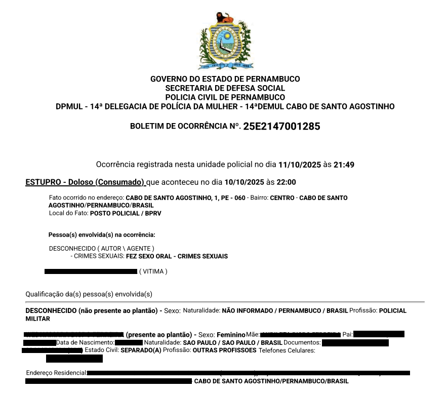 O boletim de ocorrência registrado pela vítima, cujo nome o Blog não vai divulgar na 14ª Delegacia da Mulher, no Cabo de Santo Agostinho, relata que, dirigindo até a Praia de Gaibu, foi parada numa blitz no posto do BPRv, na PE-60. Diz ela, sem mencionar o nome, que o subtenente Luciano Valério de Moura constatou multas do veículo, mostrou-as no celular, anunciou que seu automóvel ficaria retido e convidou a vítima a beber água no posto.
