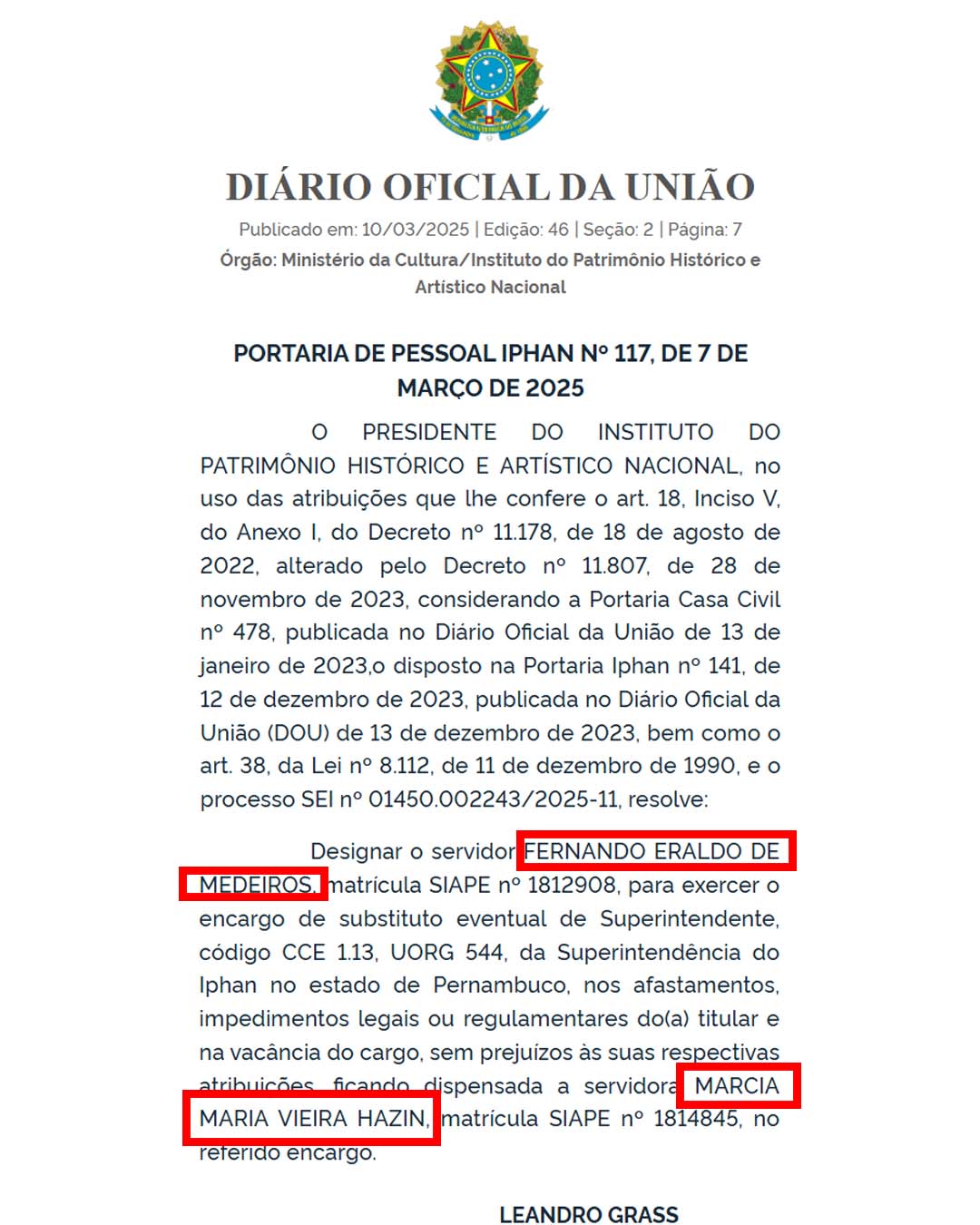 EXCLUSIVO, Por André Beltrão — Apesar de indicado pelo deputado federal Clodoaldo Magalhães (PV-PE) e ser desconhecido dos pernambucanos, o novo superintendente do IPHAN (Instituto do Patrimônio Histórico e Artístico Nacional) em Pernambuco, Fernando Medeiros, foi uma escolha técnica. Chefiava o escritório do IPHAN em Olinda, um cargo estratégico, por supervisionar a preservação de um monumento declarado em 1982 pela Unesco como Patrimônio Histórico e Cultural da Humanidade.