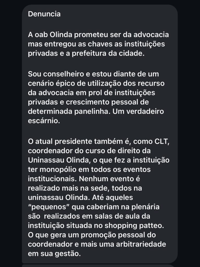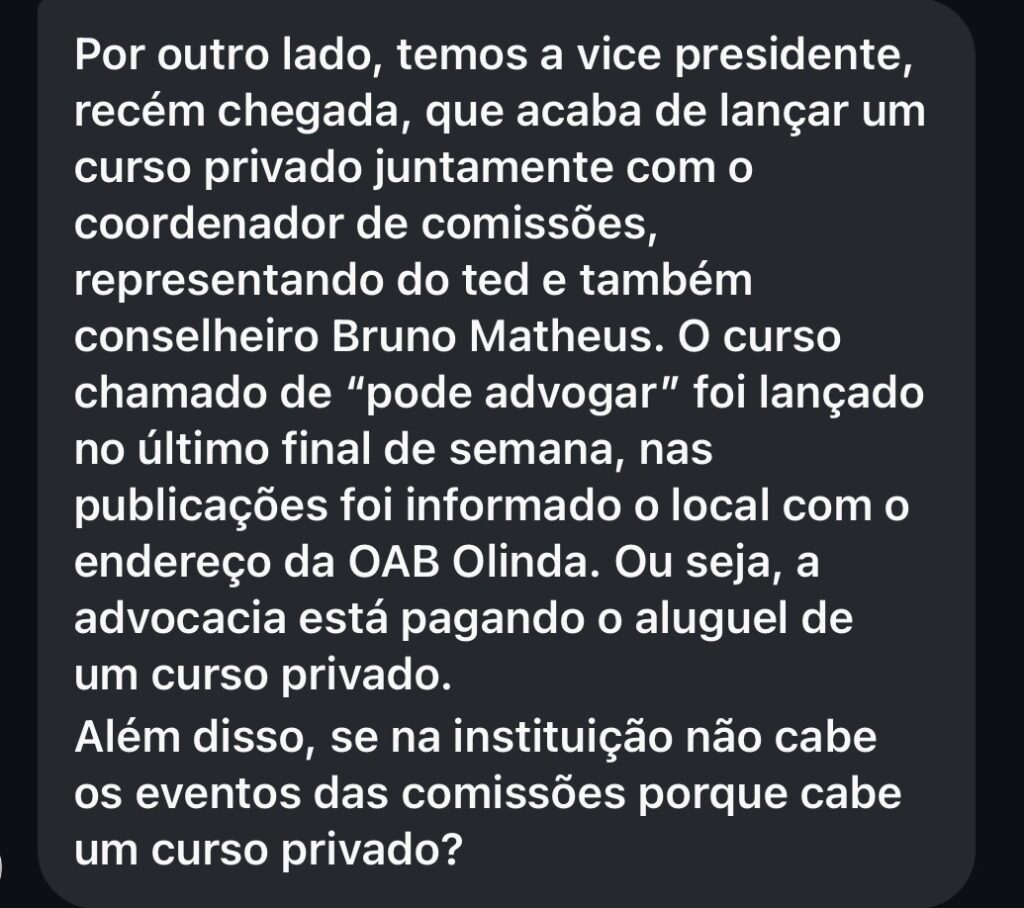 “Os advogados de Olinda pagam aluguel de um curso privado”, escreveu um dos conselheiros. De acordo com ele, é no mínimo uma contradição por um lado a sede da instituição não comportar eventos da Casa e ao mesmo tempo dispor de espaço para abrigar um curso privado.